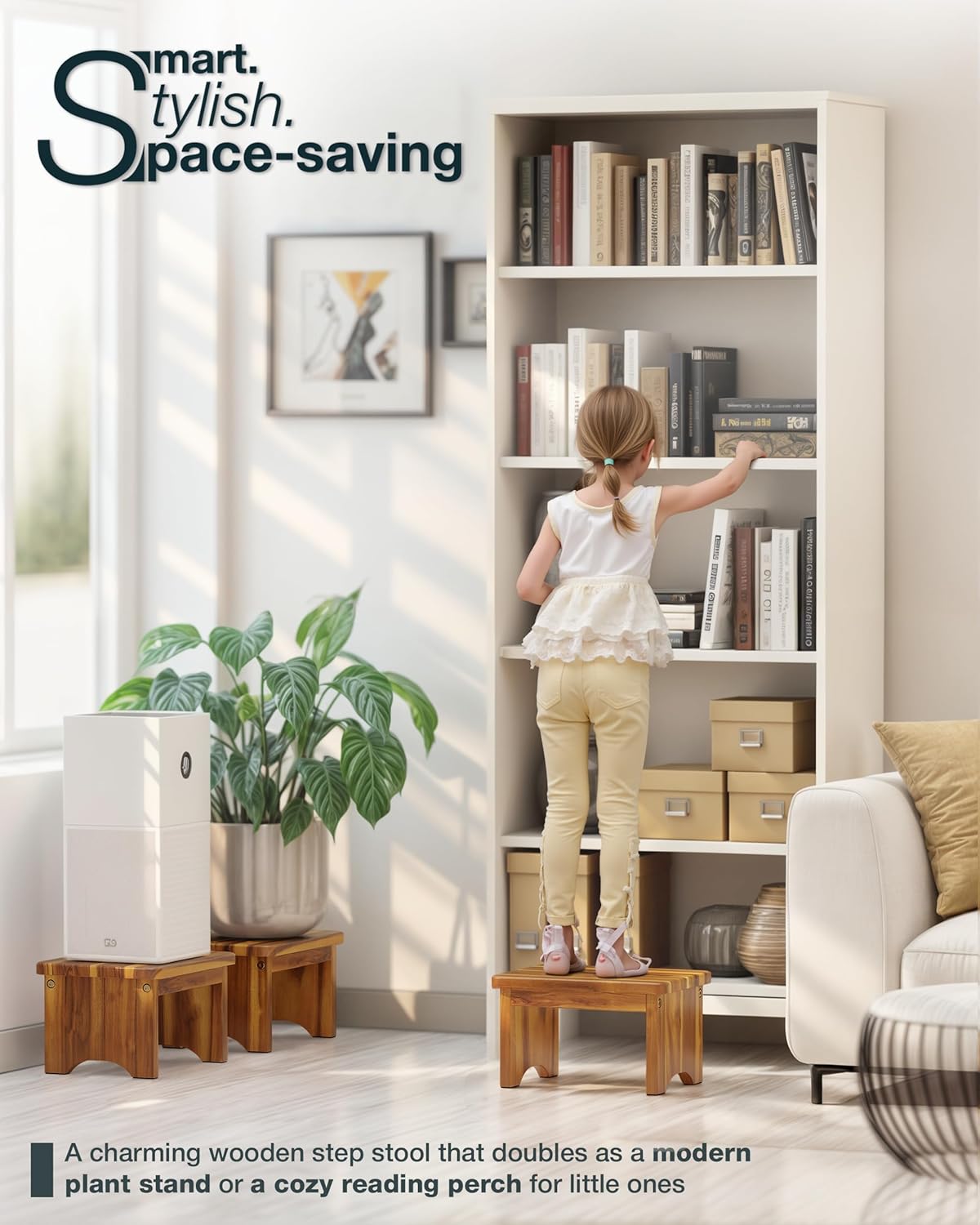 - 🔄 MULTIFUNCTIONAL UTILITY: Elevate your lifestyle with a step stool that goes beyond ordinary functionality. Whether reaching high beds, aiding in kitchen tasks, accessing high kitchen cabinet, or assisting in potty training and children's self-care, our step stool adapts to a variety of needs. It even transforms into a stylish plant stand, seamlessly integrating nature into your daily routine. Experience the perfect blend of versatility and practicality.