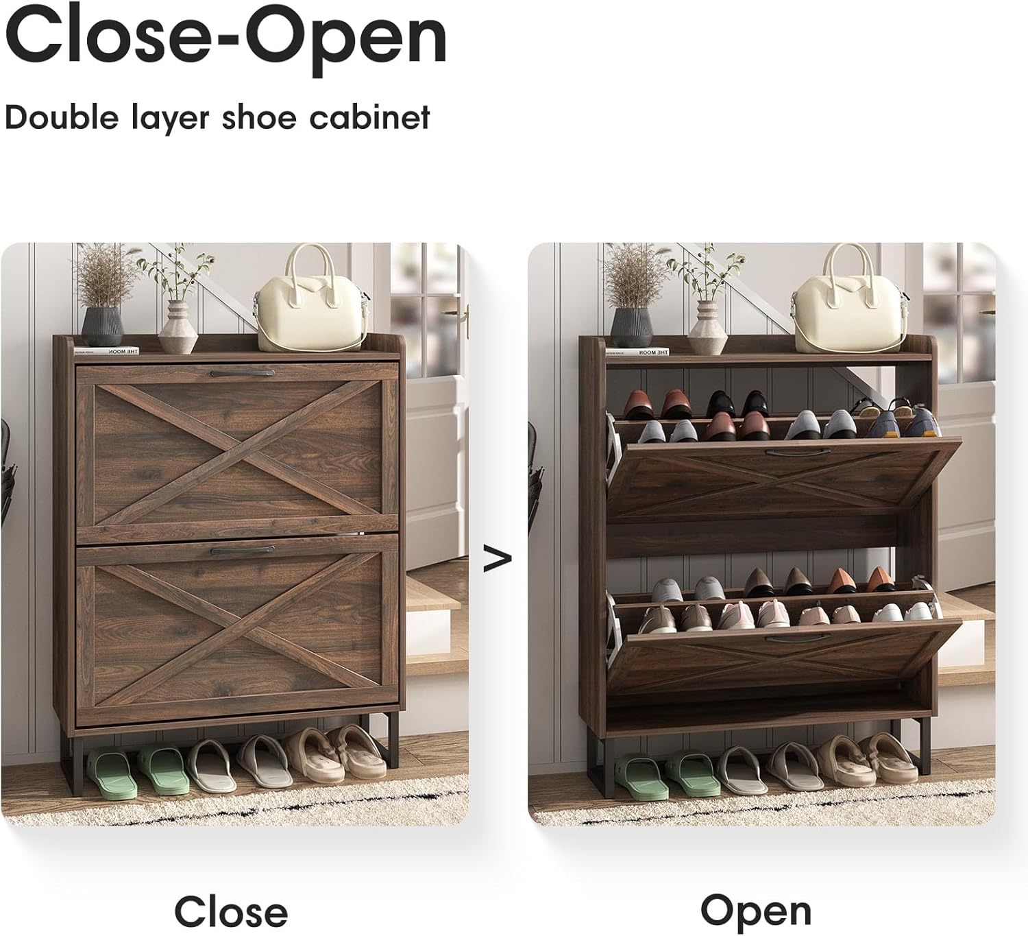 - Entryway Shoe Cabinet: The hidden shoe storage cabinet with 2 flip doors, stylish and simple dark walnut makes it a neat and beautiful finish and looks great in many different home styles. Perfect for placing in the entryway, hallway, living room, or porch, provides a neat looking in your home and space saving