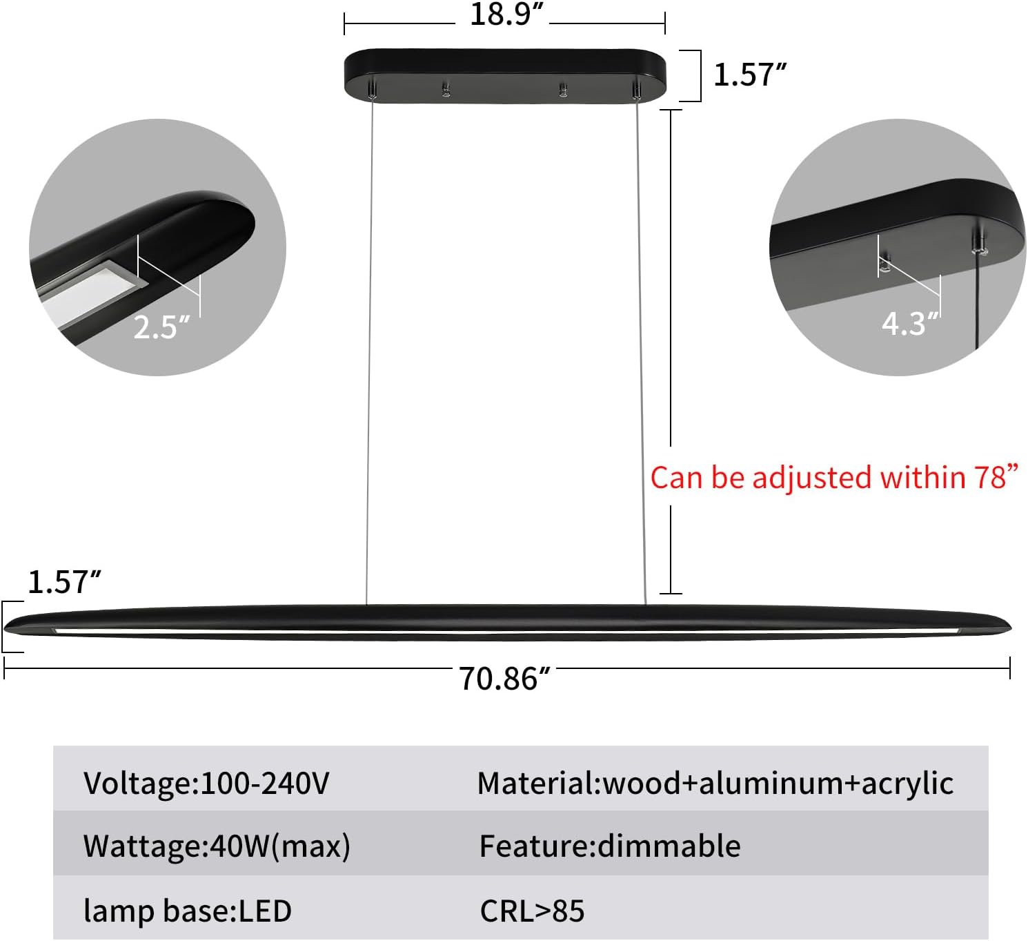 - ❤【Black Linear Pendant Dinning Room Light】This wood LED linear light is sleek and sophisticated with its matte black finsh. Dimensions: lamp body:71 x 2.6 x 1.6 inches(l*w*h). the mounting part:18.9 x 4.4 x 1.4 inches(l*w*h) can cover native American electrical box.the the cable length is adjustable up to 78 inches.notice:please do not use dimming switch, dimming equipment has been configured inside the light, please use ordinary wall button switch. otherwise the light fixture may flicker.
