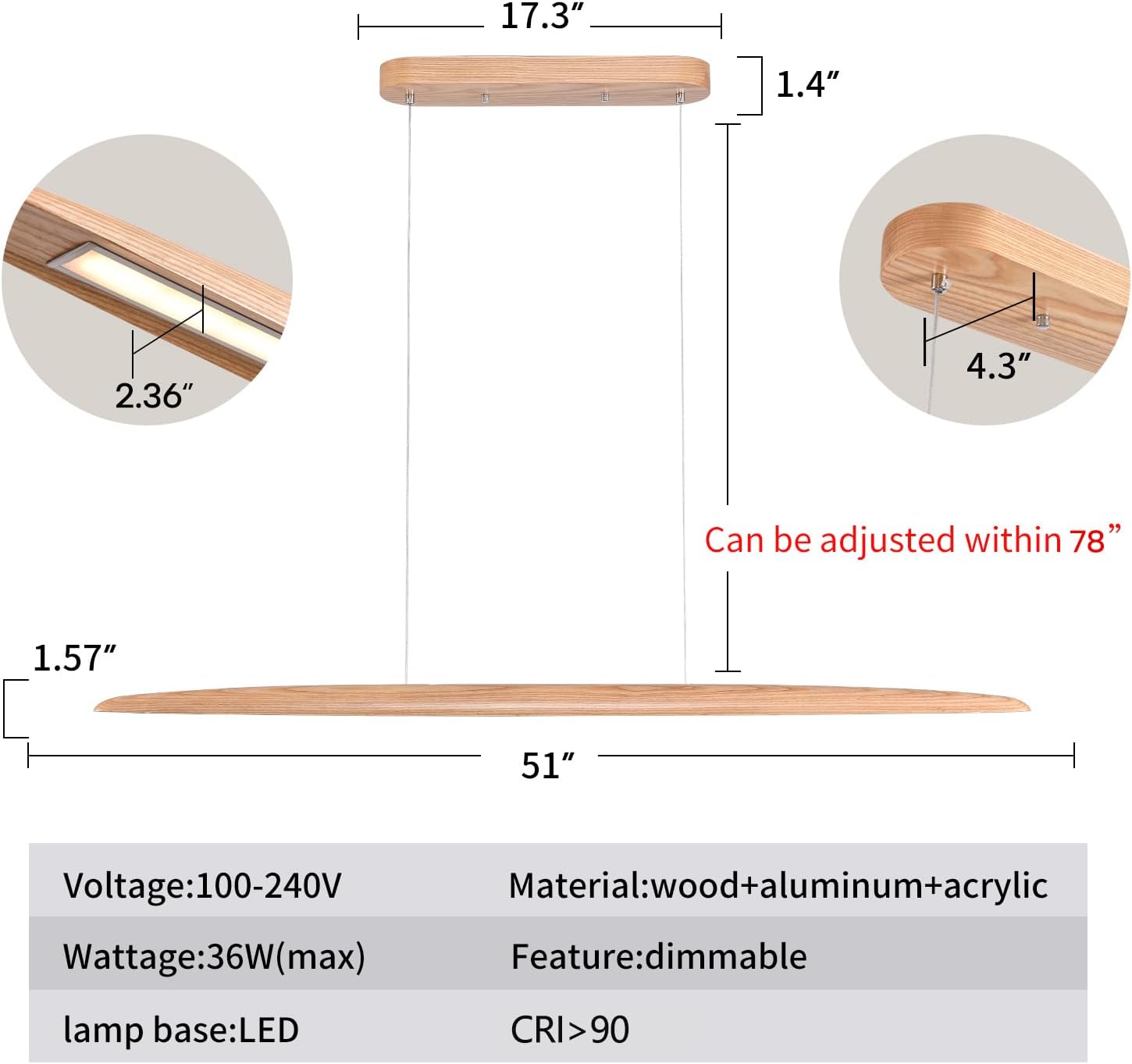 51" 36W Wood LED Linear Pendant Light Fixture Led Dining Room Light Dimmable Hanging Light Fixture for Dining Room Kitchen Island Pool Table Lights Natural Ash