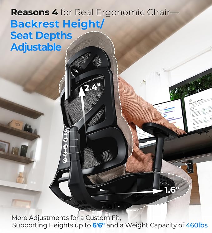 - š ADVANCED LUMBAR SUPPORT - Dynamic lumbar system automatically adjusts to your spine's natural S-curve, reducing back strain by up to 80%. Breathable mesh back with 4-level height adjustment ensures perfect alignment for users 5'1" to 6'6".
