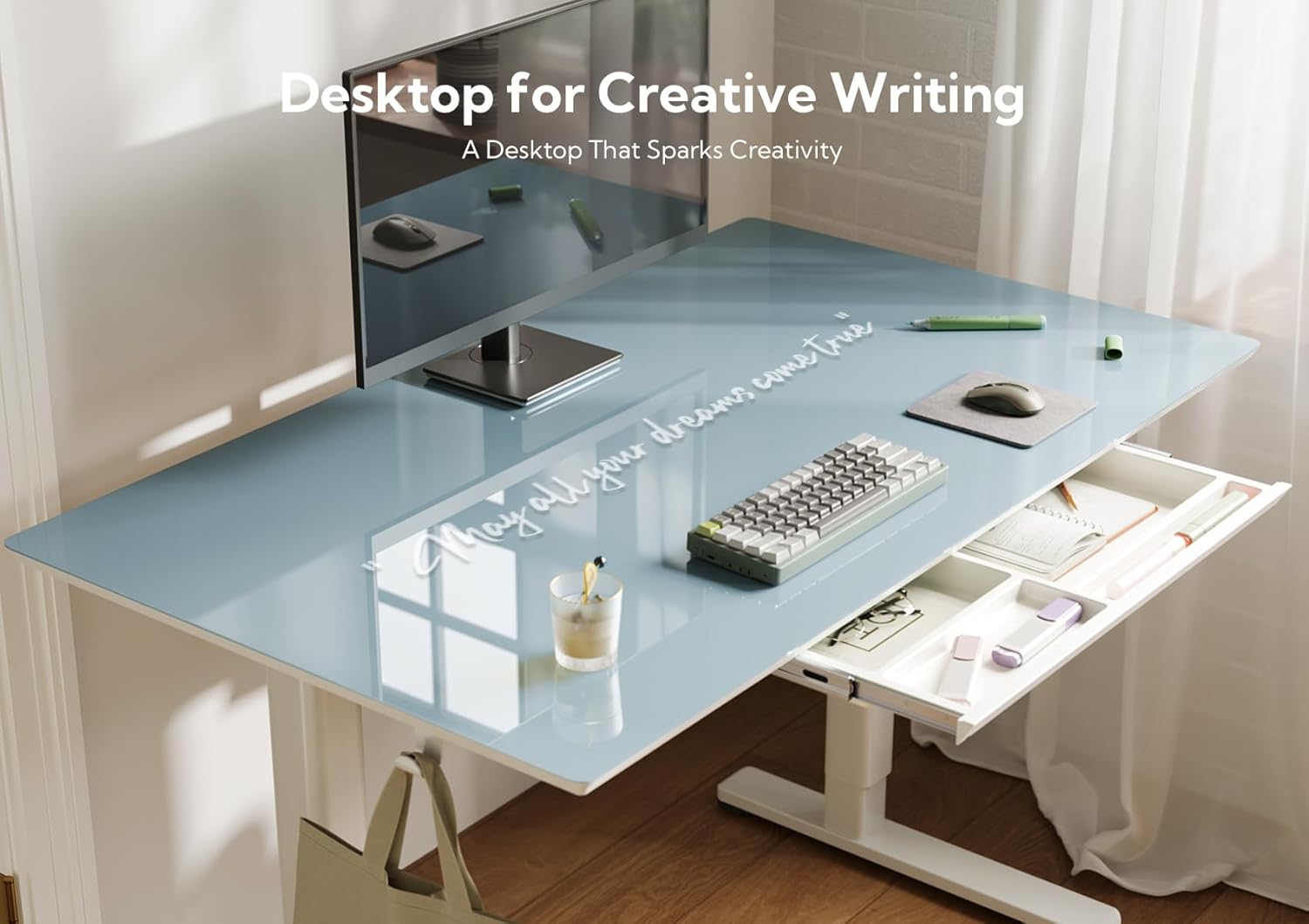 - Unique Color Design: The glass version of the electric height-adjustable desk features a design with a Morandi blue desktop, showcasing a delicate and fashionable aesthetic. By incorporating the blue color scheme into the transparent glass material, the entire tabletop appears fresh and comfortable.