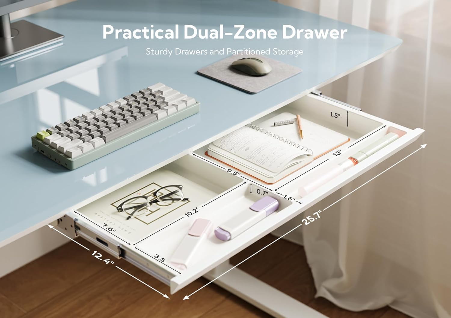 - Divider Drawer: The built-in pull-out divider drawer provides a hidden storage solution, making it easy to organize the desktop, giving you more space, and reducing clutter.