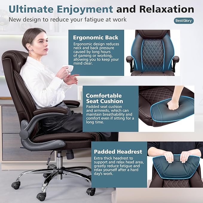 - 【Ergonomic Office Chair】The ergonomic design of the backrest reduces neck and back pressure caused by long hours of gaming or working, allowing you to keep your mind clear. The seat cushion is wider and double padded to offer a soft sitting feeling and long-lasting support. Soft flip-up armrests provide optimal support and relieve hand pressure. What a pleasure to enjoy such a comfortable office chair in the midst of tired work;