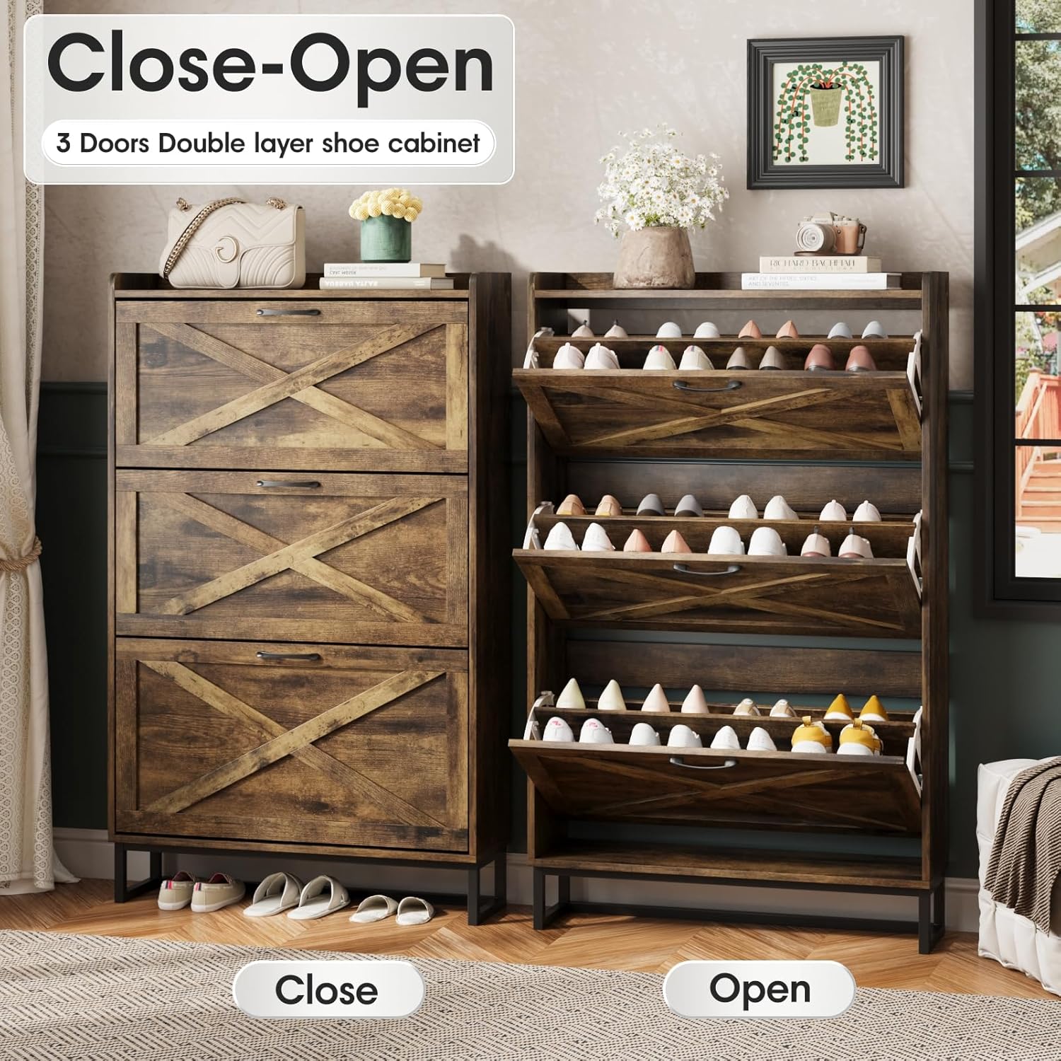 - Entryway Shoe Cabinet: The hidden shoe storage cabinet with 3 flip doors, stylish and simple rustic brown makes it a neat and beautiful finish and looks great in many different home styles. Perfect for placing in the entryway, hallway, living room, or porch, provides a neat looking in your home and space saving