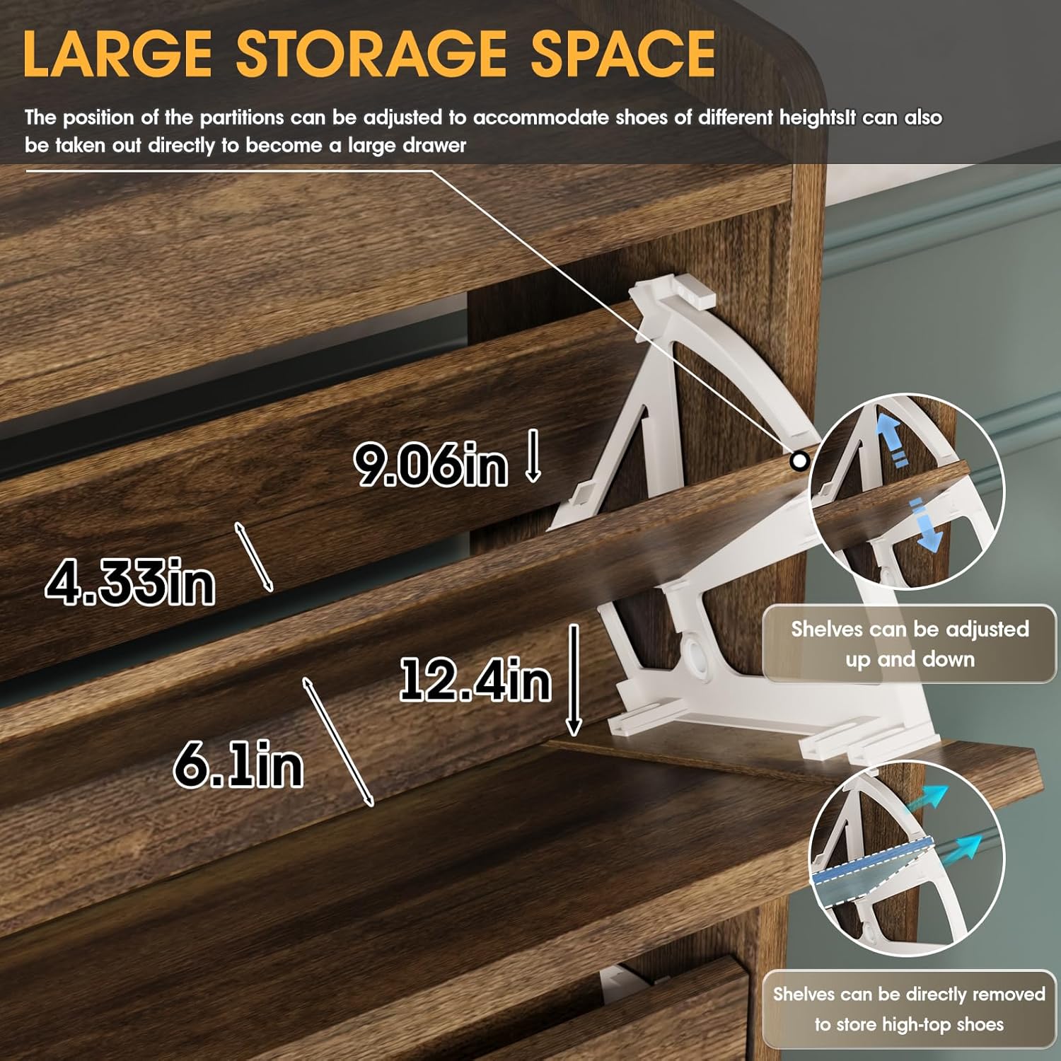 - Large Capacity Shoe Cabinet: The drawer shoe cabinet can store up to 28-36 pairs. There are three upper and lower drawers, each drawer contains two layers of storage space. The panel can be adjusted or removed in two grooves to accommodate different heights and sizes of flats, mid boots or heels! Slippers or sweeping robots can be placed on the bottom. There is a fence on the top, ideal for placing potted plants, ornaments, socks and keys, without worrying about falling