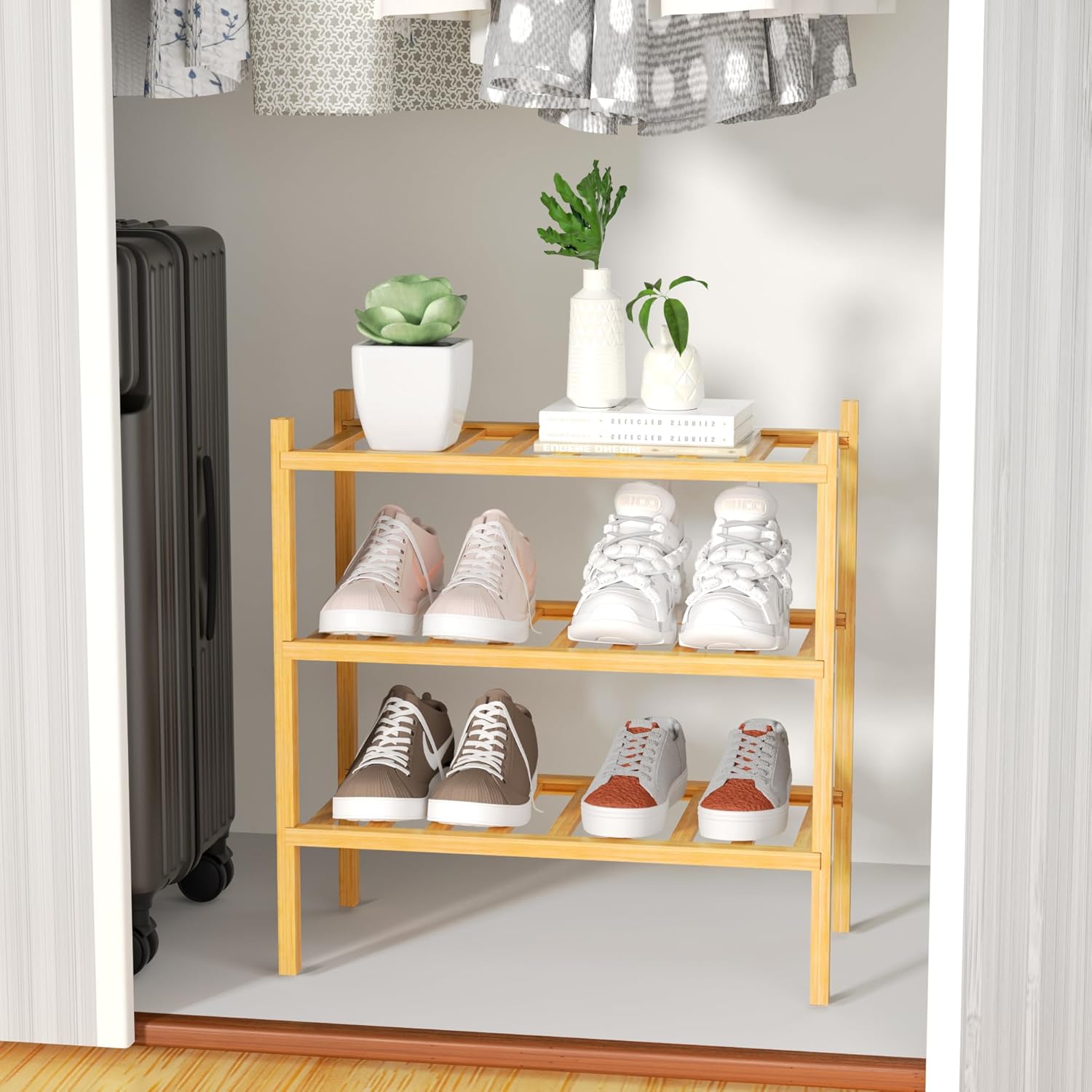 3-Tier Bamboo Small Shoe Rack, Free Standing Wood Shoe Shelf Storage Organizer for Closet Entryway Stackable (Natural)