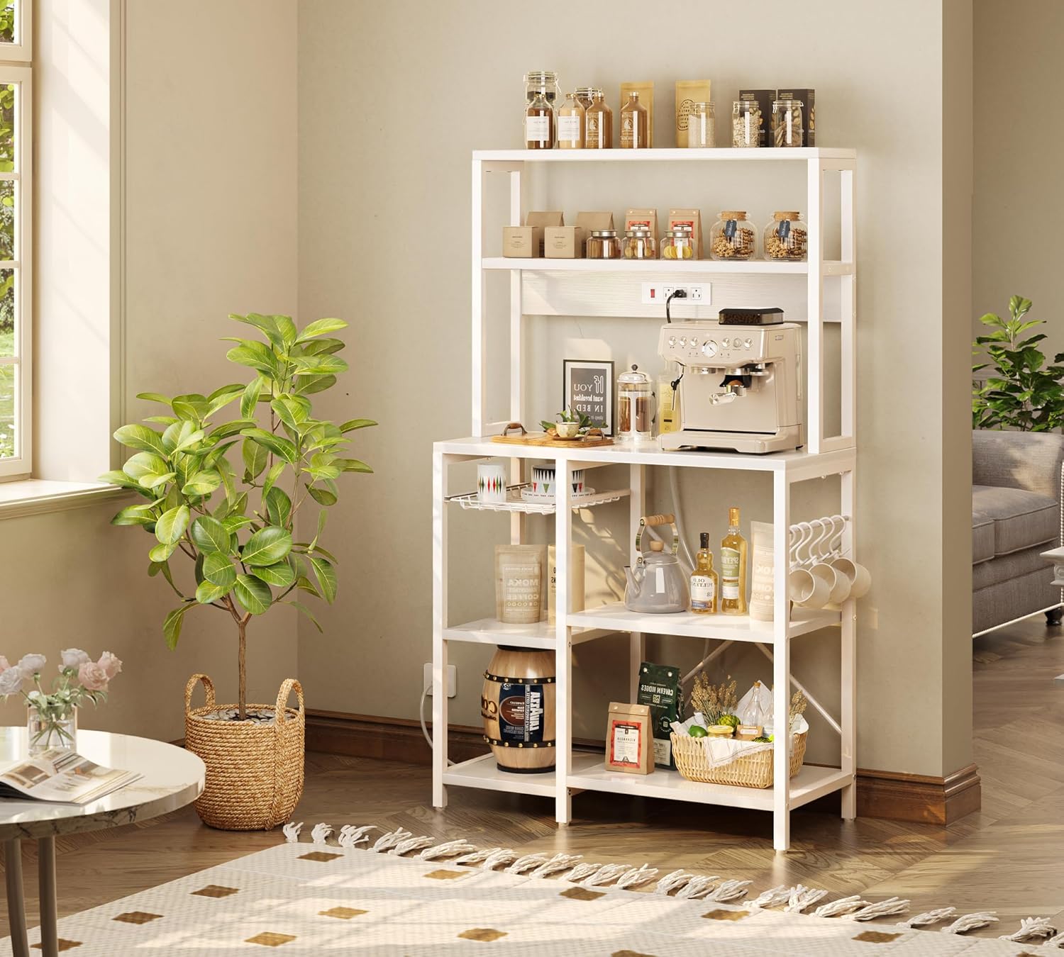 SUPERJARE Bakers Rack with Power Outlet, 35.4 Inches Coffee Bar with Wire Basket, Kitchen Microwave Stand with 6 S-Shaped Hooks, Open Storage Shelves, White