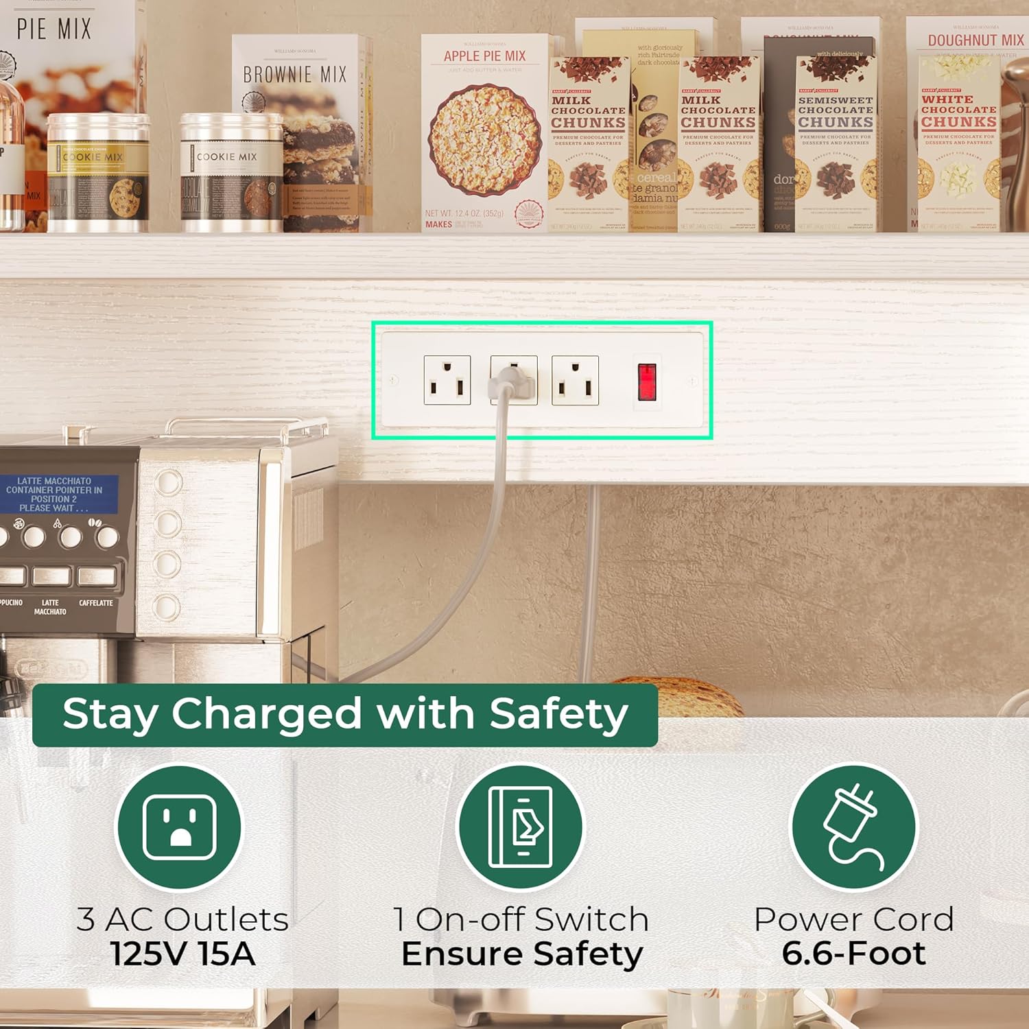 - ă3 AC Outlets & 1 On-off Switchă Delight baking enthusiasts or coffee lovers in no time with a power strip built into the kitchen shelf rack! Plug in your kitchen supplies within reach, more charging spots, and more safety with the switch off when they are not in use. All for a tidy and safe kitchen space