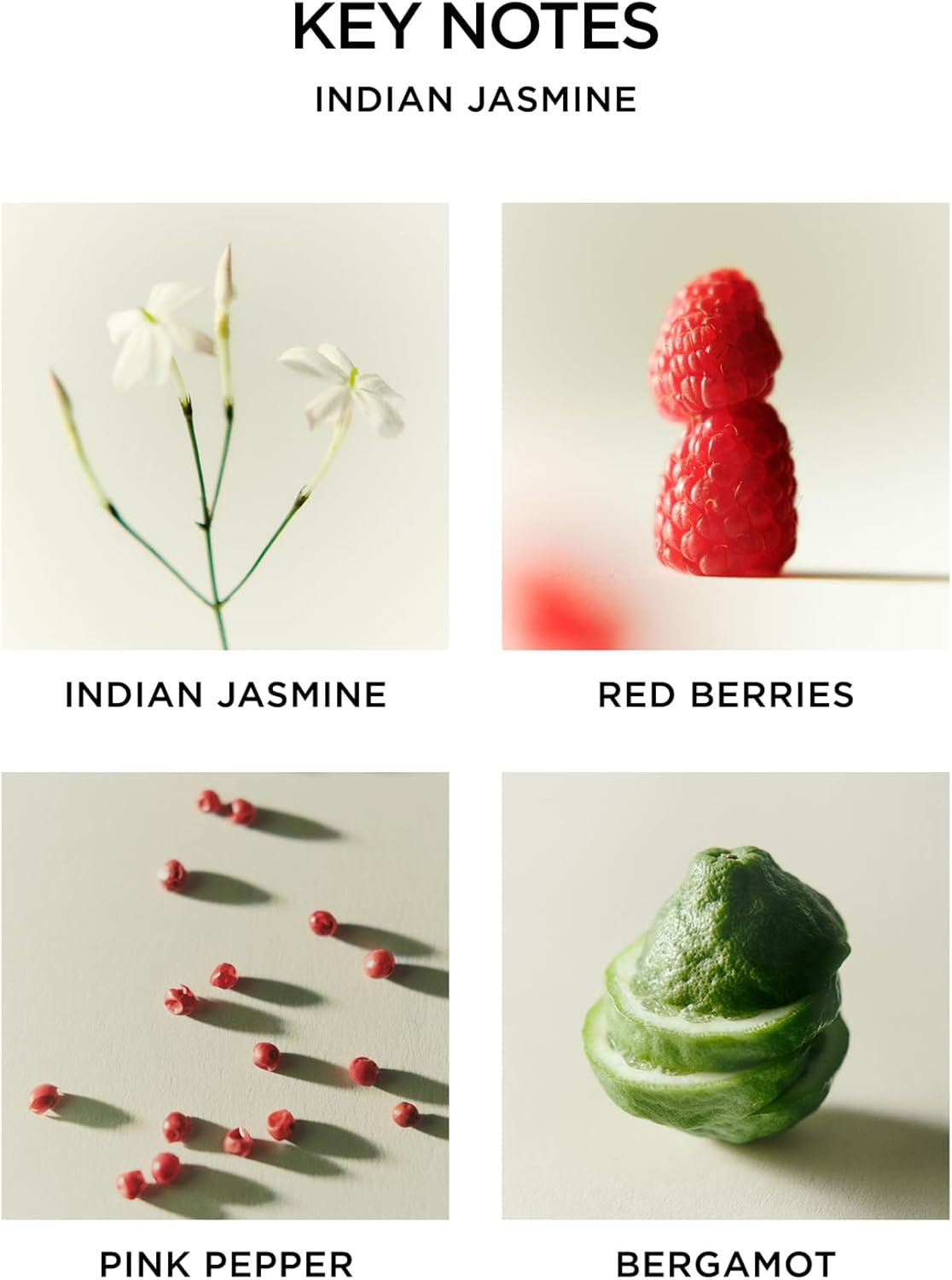 - CLASSIC FLORAL - Immerse yourself in the lush jasmine fields of India with an intense jasmine absolute surrounded by red berries, sparkling bergamot, and spicy pink pepper.