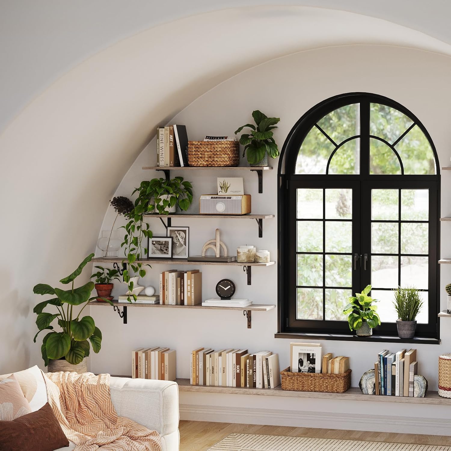 - ăAdd Finishing Touch to SpaceăMid-century design adds a retro-chic vibe to your home. Rusticity wood grain and exquisite S-shaped iron brackets flaunt visual interest and romance. They are full of character and enhance the texture of the space. A classy way to display your beloved decorations