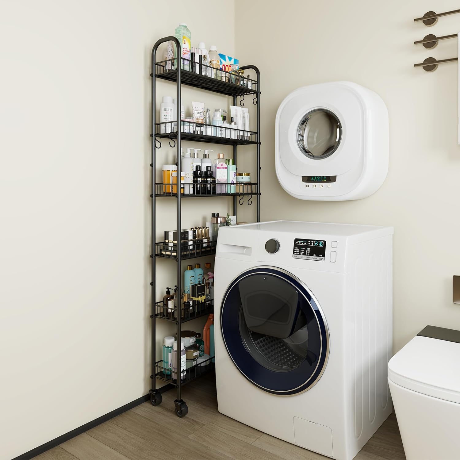 - ROLLING STORAGE CART: The 6 tier slim kitchen organizers and storage cart is 6" design which can be used in tight spaces in your home for storage. Suitable for closets, kitchens, bathrooms, garages, laundry rooms, offices or in-between your washer and dryer.