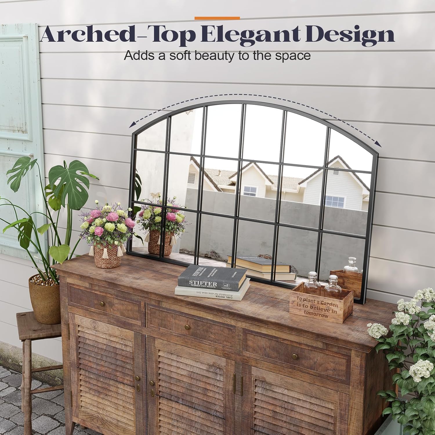Wide Window Pane Mirror, 44" x 28" Black Arched Mirror for Wall, Grid Large Decorative Wall Mirrors for Living Room Bedroom Farmhouse Fireplace Hallway Entryway