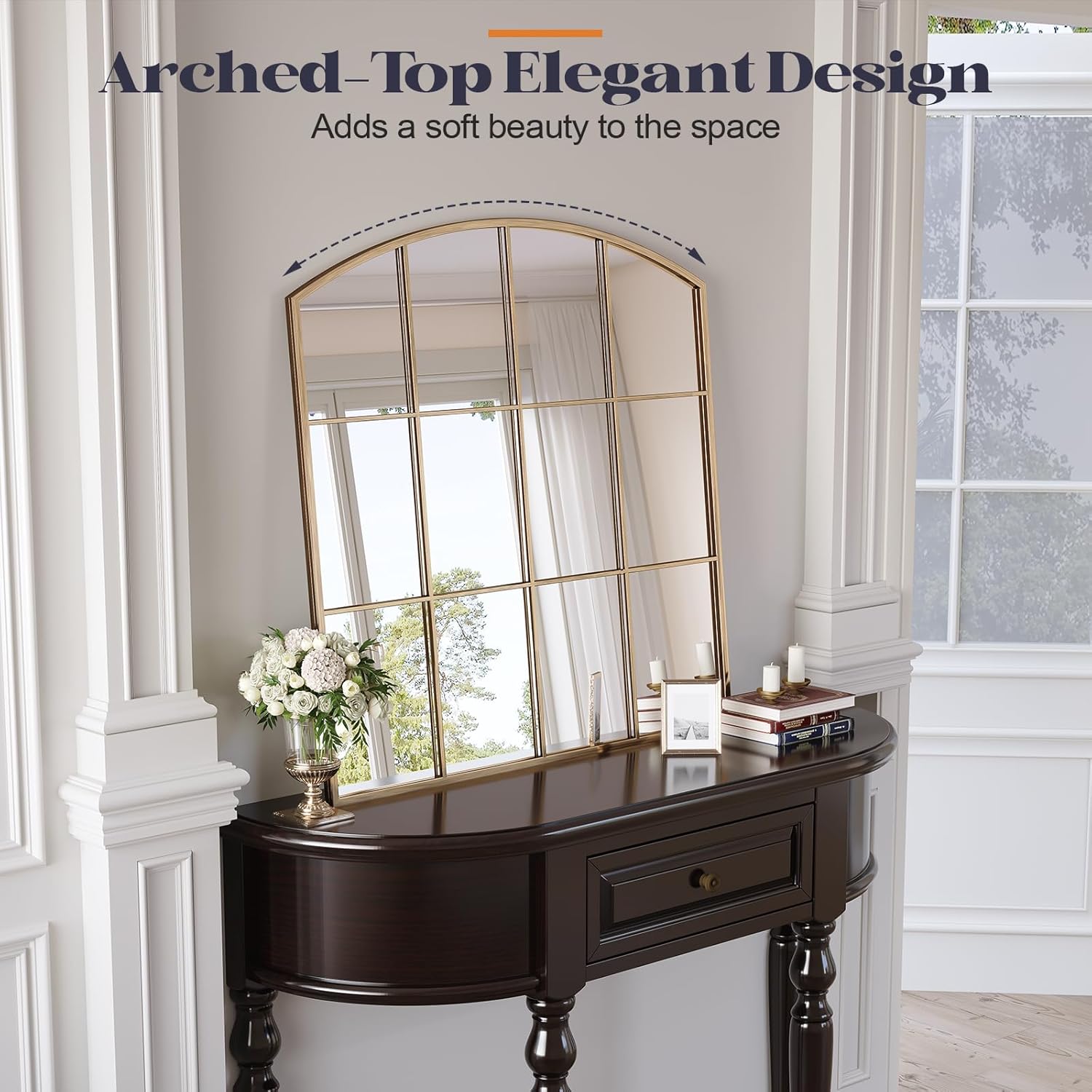 - HD Glass: The arched wall mirror is made of a full metal frame, which is rust-resistant. The high-definition 4 mm glass provides clear and undistorted reflections, enhancing the room's atmosphere
