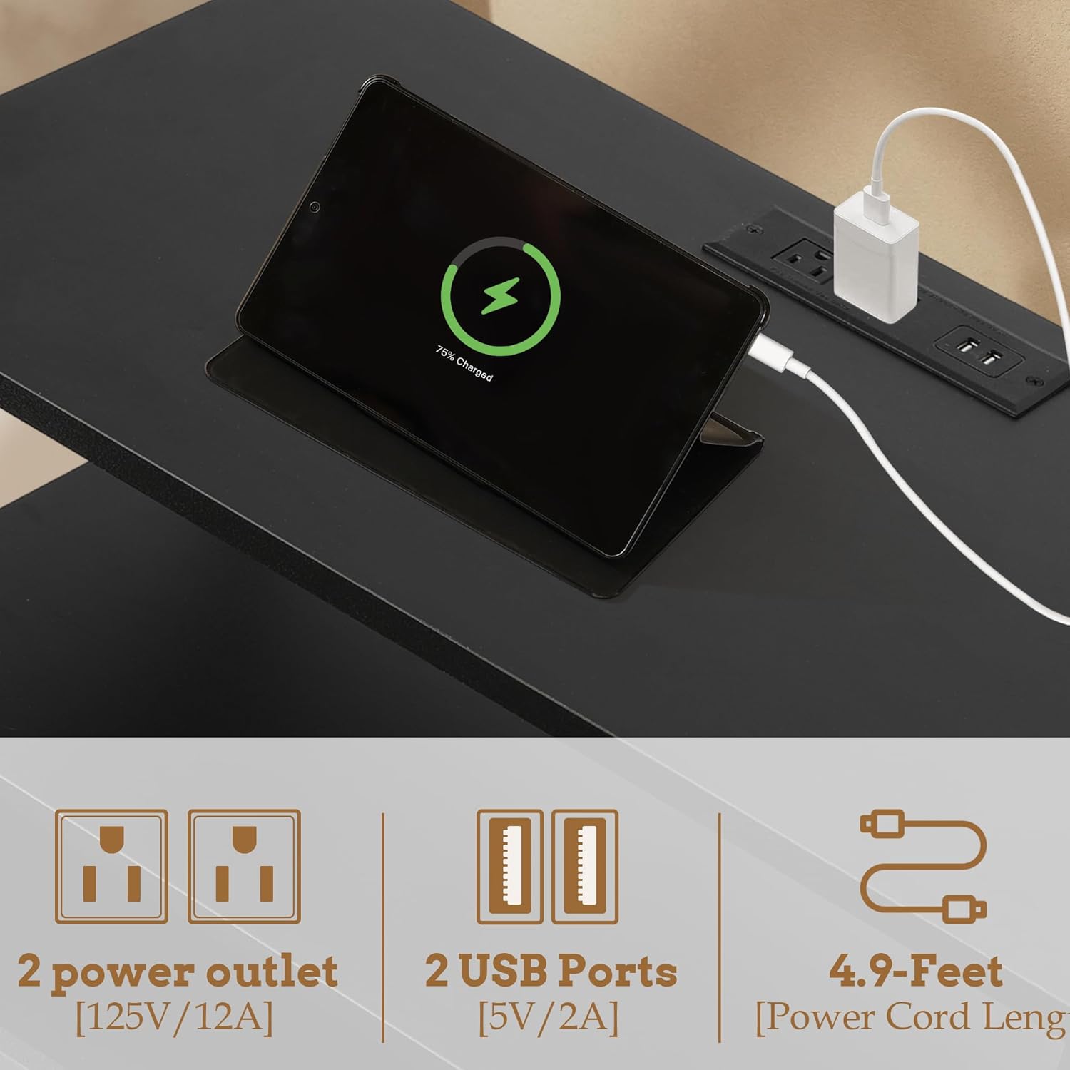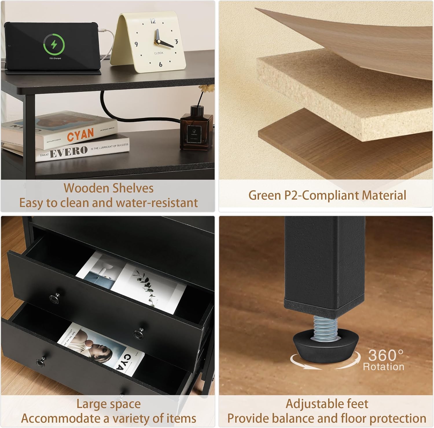 - Sturdy and Long-lasting Construction: The side table with charging station is made of engineered wood and steel, making it long-lasting and sturdy. The wood top is finished with a smooth, elegant finish. It's adjustable feet allow it to sit level on uneven surfaces.