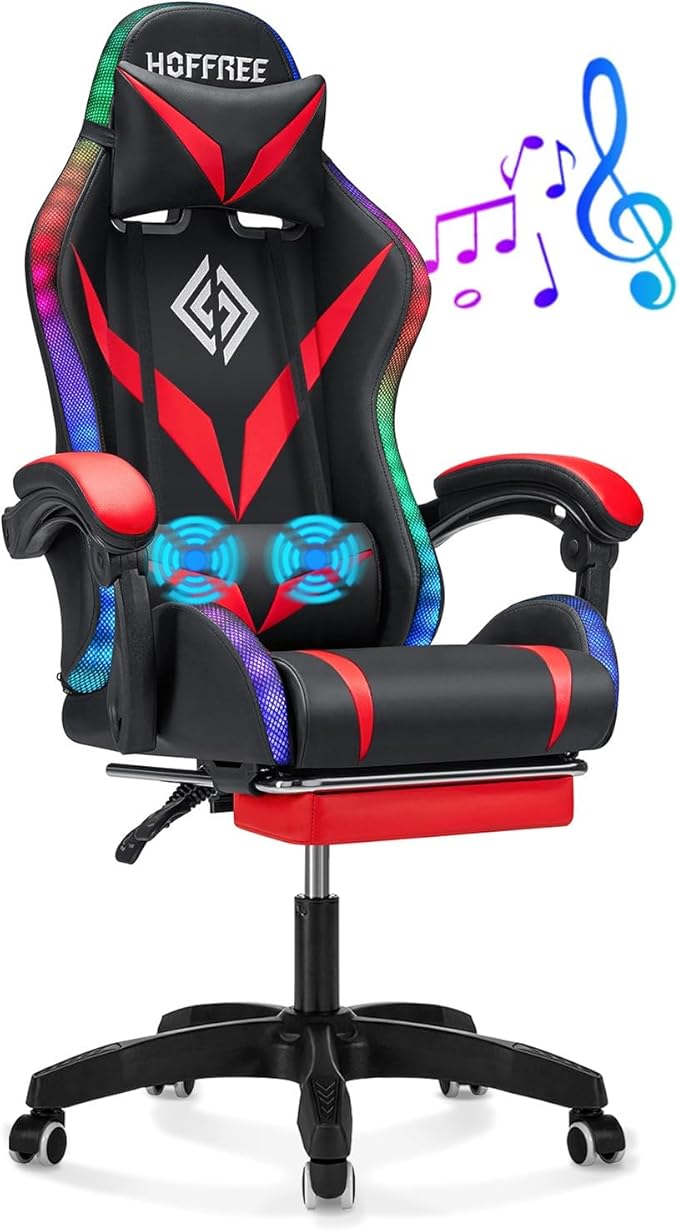 HOFFREE RGB Gaming Chair with Speakers and Massage Ergonomic Computer Chair with Lights and Footrest Reclining Video Game Chairs for Adults Red and Black