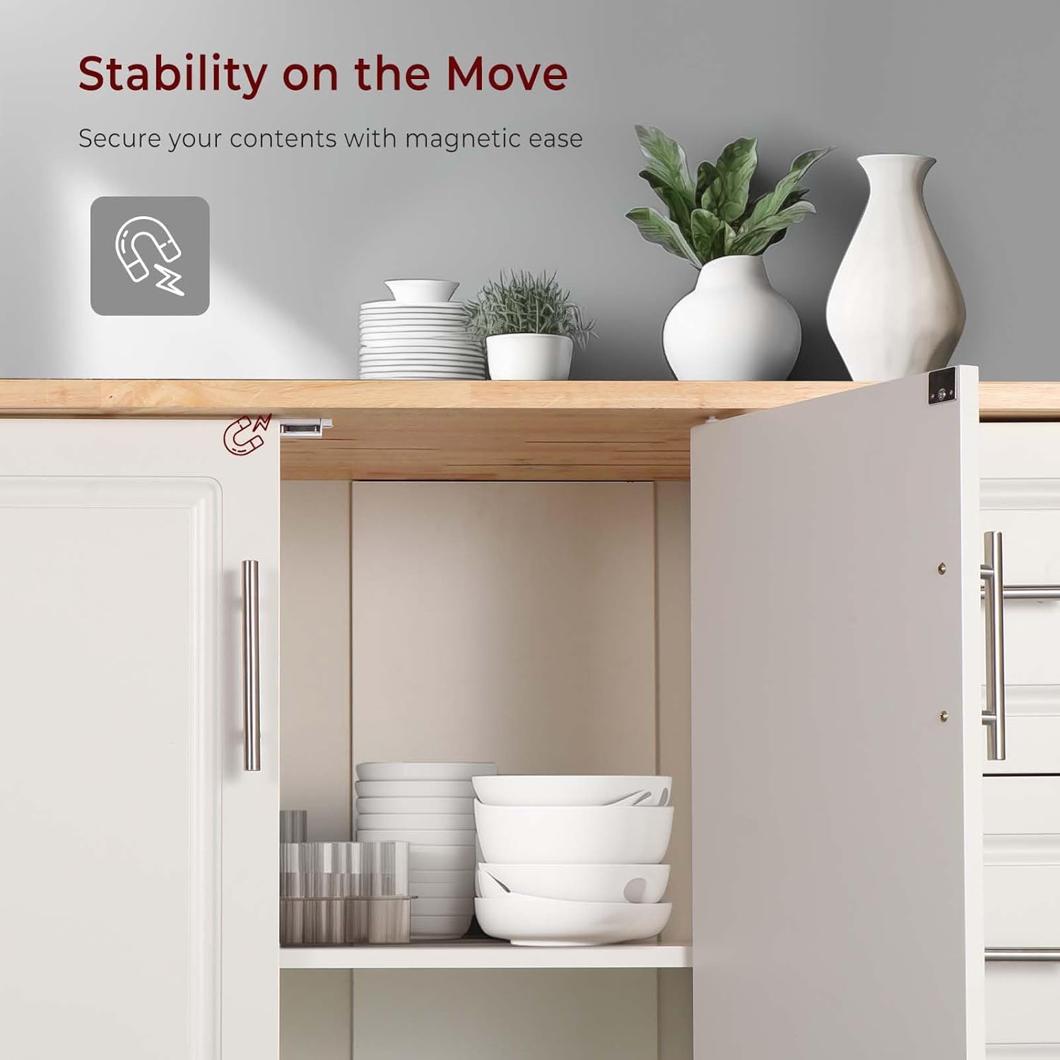 - 【Upgrade Your Kitchen Today】Enhance your kitchen's functionality and style with our versatile white kitchen cart cabinet; Whether you're looking for added dining space, increased storage, or a dependable workstation, our cart has you covered