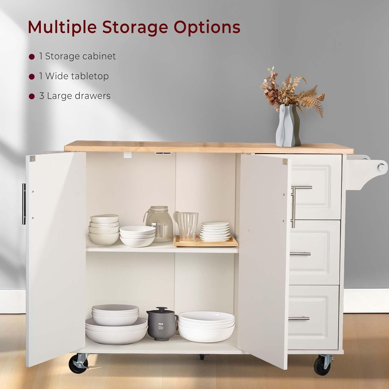54" Rolling Kitchen Island Cart with Storage, Large Kitchen Cart Cabinet with Folding Drop Leaf Breakfast Bar, Wood Island Table with 3 Drawers and Spice Rack & Towel Rack, White