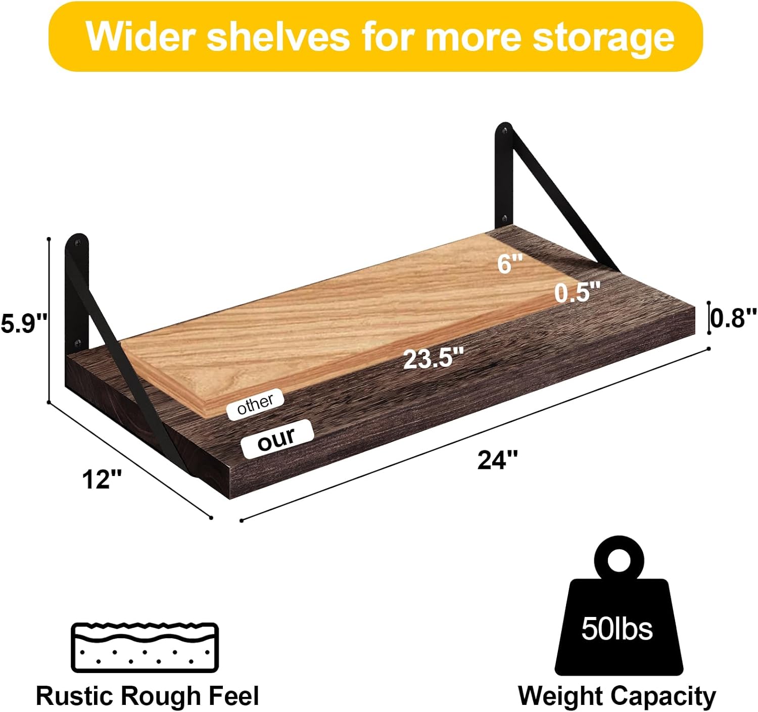 - Wide Floating Shelves: We've widened these shelves, providing more wall storage to display and organize items for all your daily needs; The dimensions are 12" D x 24" W x 5.9" H, with a 0.8" thick solid wood board