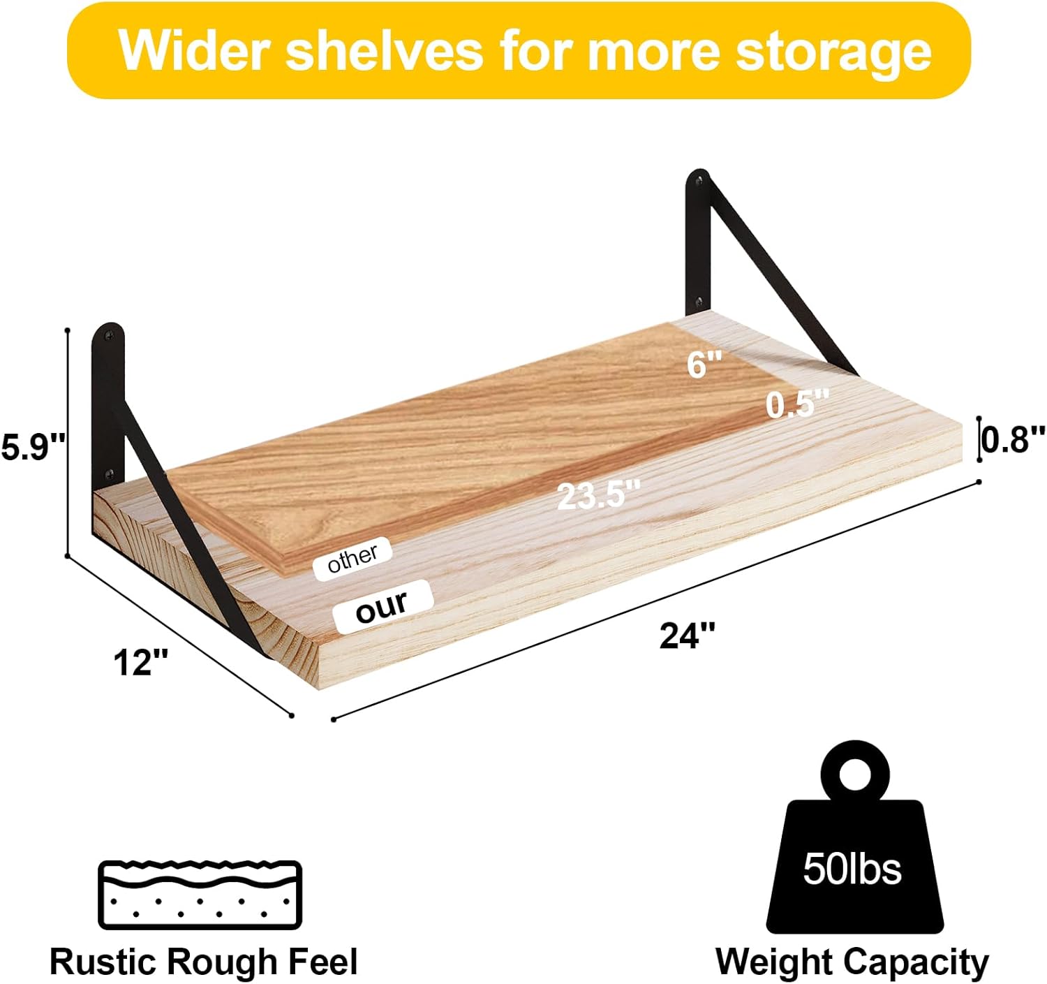 - Wide Floating Shelves: We've widened these shelves, providing more wall storage to display and organize items for all your daily needs; The dimensions are 12" D x 24" W x 5.9" H, with a 0.8" thick solid wood board