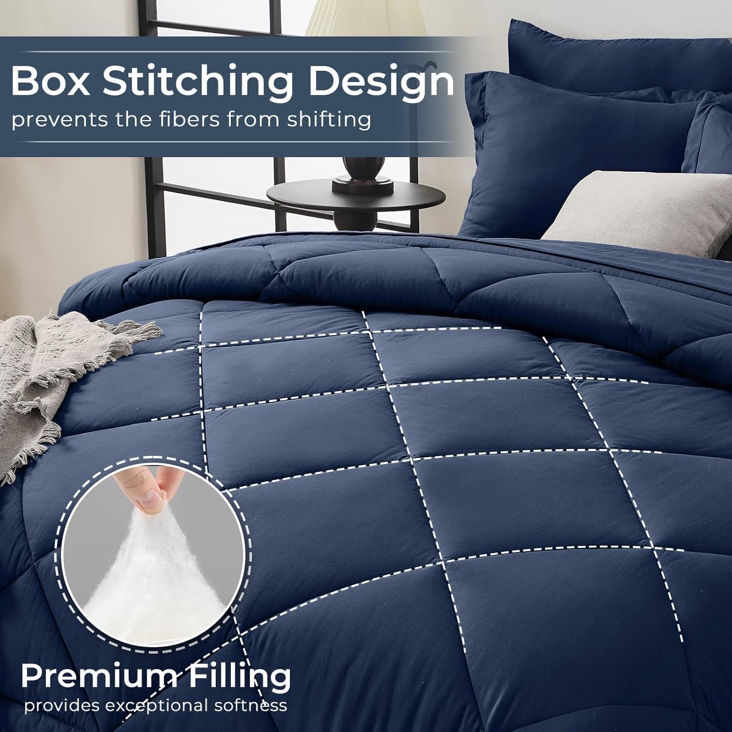 - Practical Details: The 360° elastic fitted sheet with a deep pocket fits most mattresses about 10"-14" deep. The baffle box construction of the comforter prevents the fiber fill from shifting, even after several times of wash