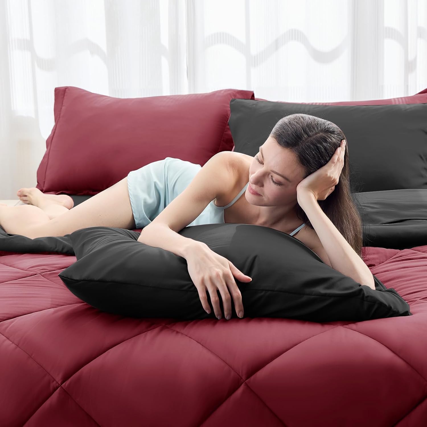 HEVUMYI Red & Black Cali-King Comforter Set - 7-Piece All Season Bed in a Bag Cali-King, Ultra Soft Burgundy Bedding Set with Comforter, Flat Sheet, Fitted Sheet, Pillowcases, Pillow Shams, Burgundy