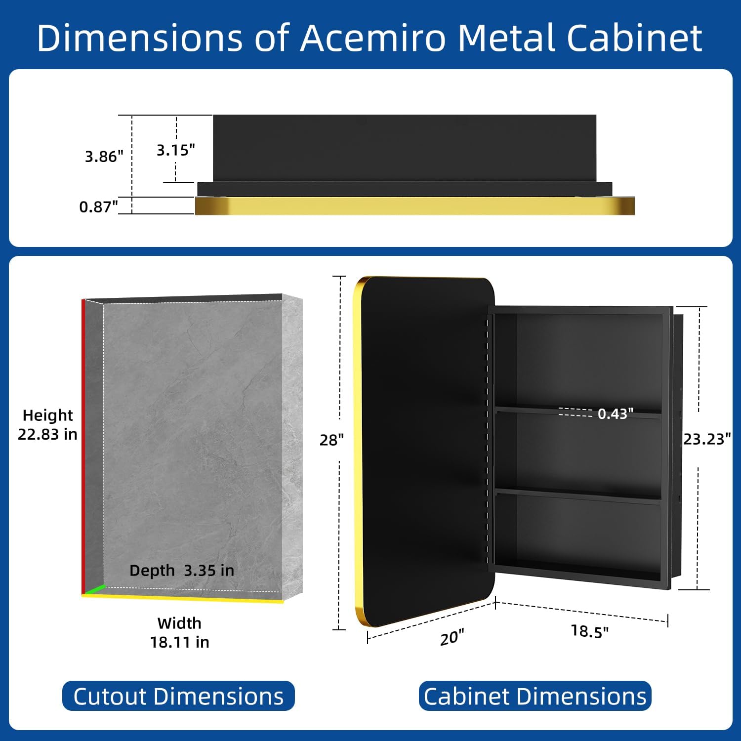 - Substantial and Durable Cabinet - ACEMIRO medicine cabinet is engineered with refined quality from robust metal that is built to last and withstand the daily wear and tear of a busy bathroom. The metal framed medicine cabinet with mirror seamlessly combines the aesthetic appeal of metallic luster with practicality for elevating bathroom dΓ©cor.