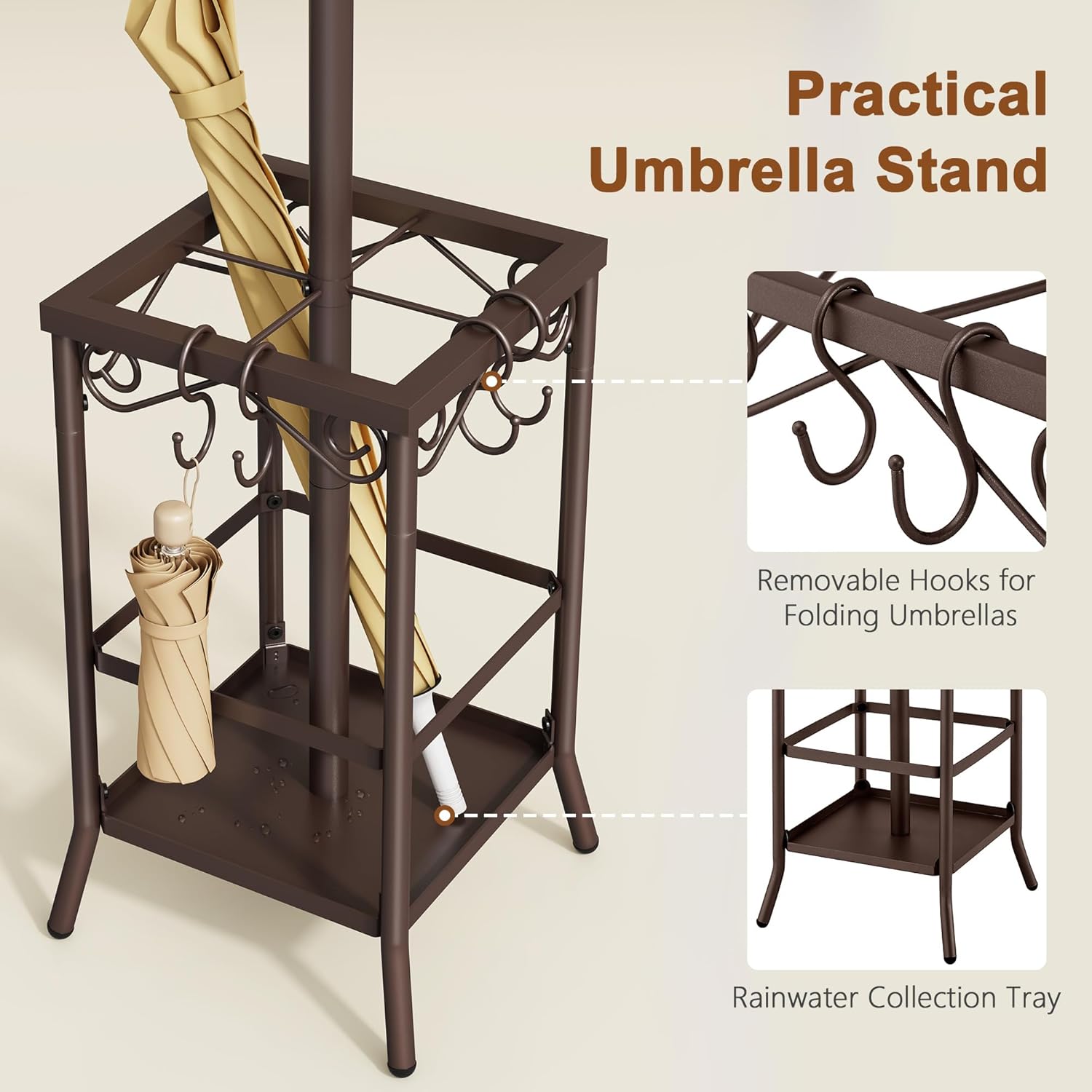 - Functional Umbrella Holder: Featuring an umbrella stand, this coat tree can hold both long-handle and folding umbrellas. The bottom tray is designed to protect your floors from rain water damage, providing a reliable storage solution for wet umbrellas