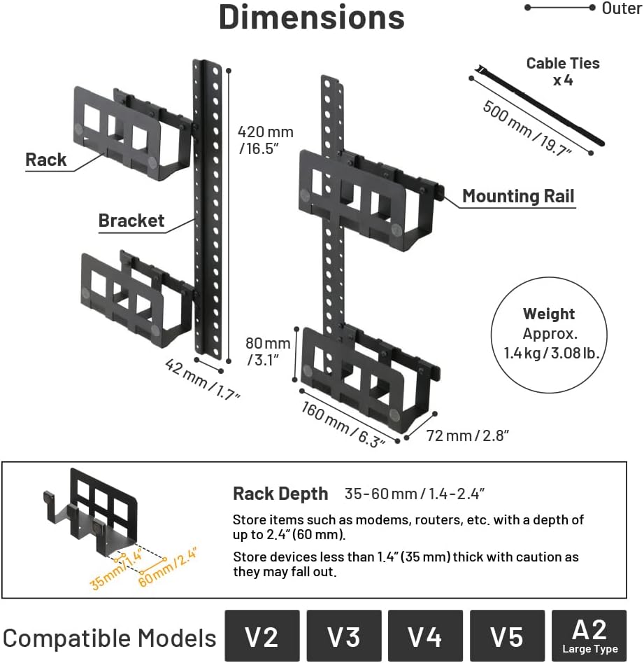 - 【SIZE & COMPATIBILITY】1 Rack: 16 cm W x 7.2 cm D x 8 cm H (6.3" W x 2.8" D x 3.1" H); Weight: Approx. 1.4 kg (3.08 lb); Load capacity: Approx. 1.5 kg (3.3 lb) per rack. This rear-TV multi-device mount is an accessory for WALL brand Japanese TV stands. It is compatible with V2, V2 CASTER, V3, V4, and V5 models of WALL universal against-the-wall TV stands and the WALL A2 Large Type model.