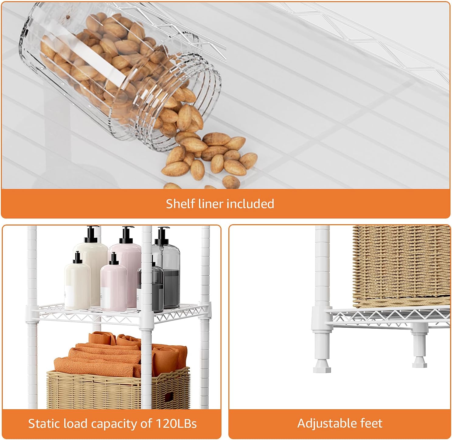 - SUPERIOR MATERIALS: Our storage rack is made of carbon steel, which greatly improves its load-bearing capacity, and ensures its stability and durability. It also comes with a few plastic shelf liners, which can prevent small items from falling.