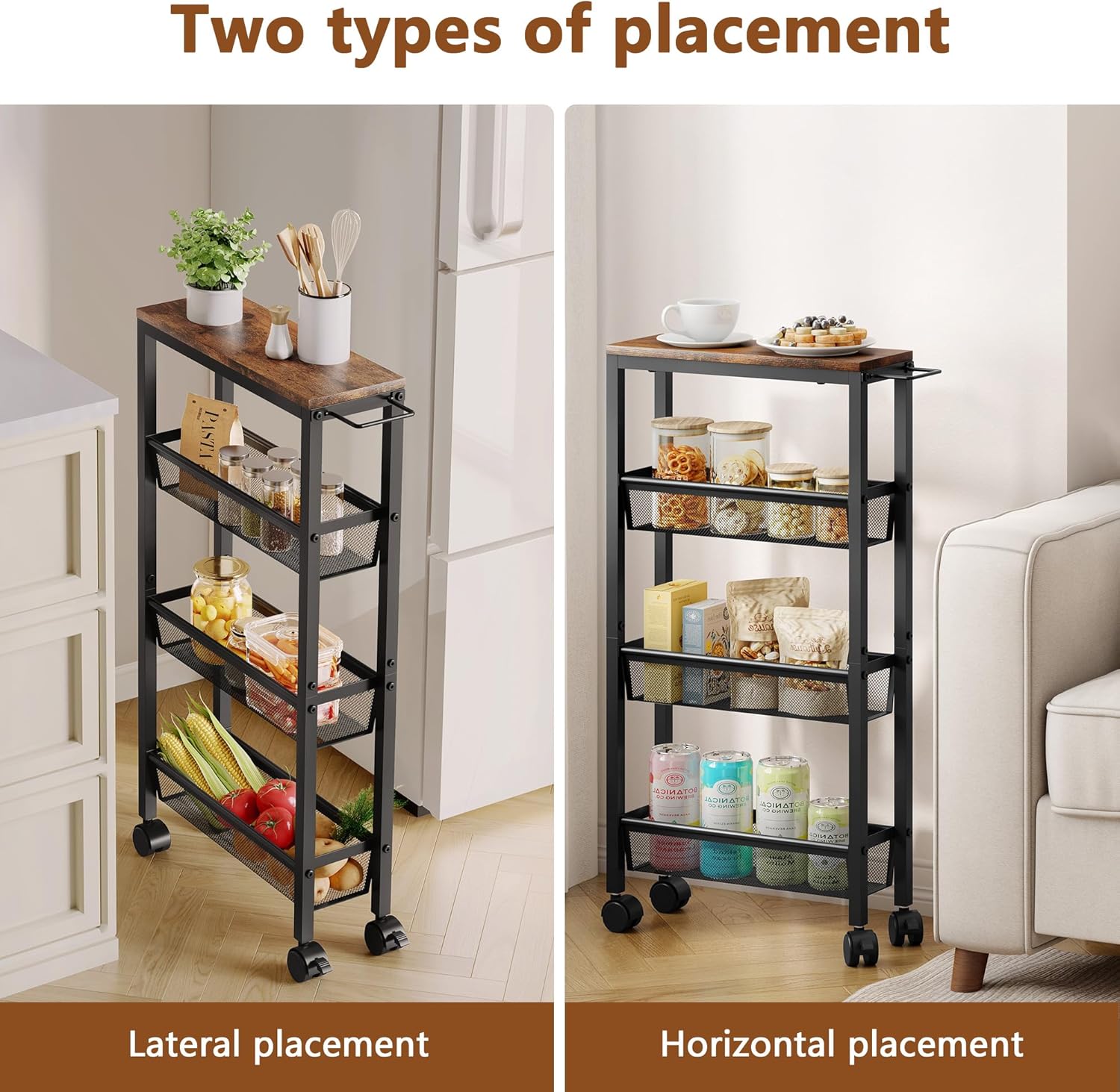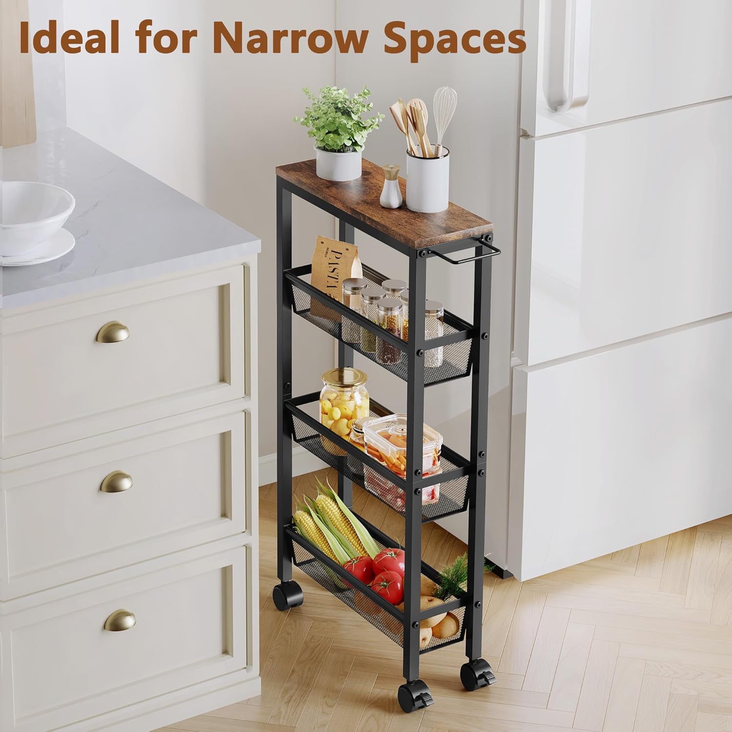 - KITCHEN CART WITH WHEELS : The narrow storage shelves has 4 lockable PP wheels, you can freely choose the placement as you need. The multi-functional storage shelf can be sturdily fixed in the desired placement, easy to place in the garage, wardrobe, kitchen, porch, pantry, etc., easy to move.