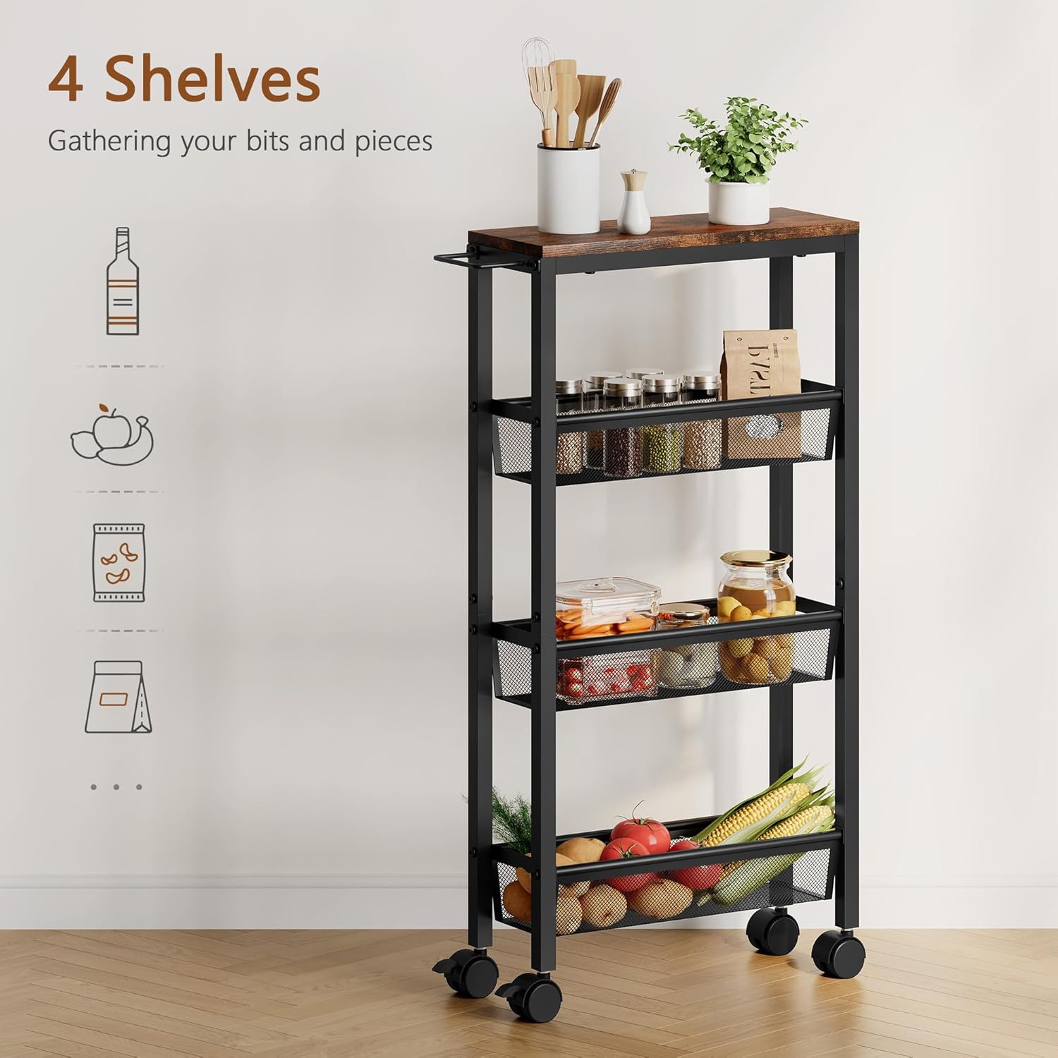 - KITCHEN STORAGE CART: 4 shelves made of metal material and wooden boards, easy to clean and durable. Shelves are fitted with wire shelves and are hollowed out for easy drainage. The top shelf can safely hold approximately 60-110lbs of heavy items and the bottom 3 tiers of storage baskets have a maximum weight capacity of 22-44lbs, perfect for your family's storage needs.