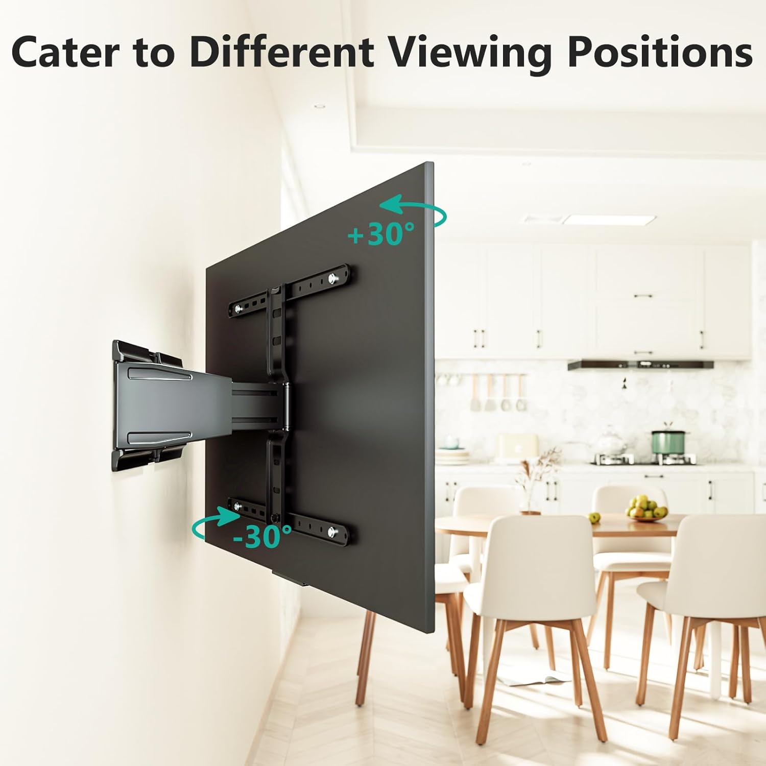 - [Adjustment] Our Full Motion TV wall mount allows the TV to be tilted and swiveled for a better view angle. It can be tilted +3°/-15° to avoid glare and swivel +30°/-30°. It allows you to tilt the TV up or down to find the suitable viewing position, reducing glare and improving your overall viewing experience. This wall mount tv bracket is good for living room, bedroom, kitchen, office or any other place.