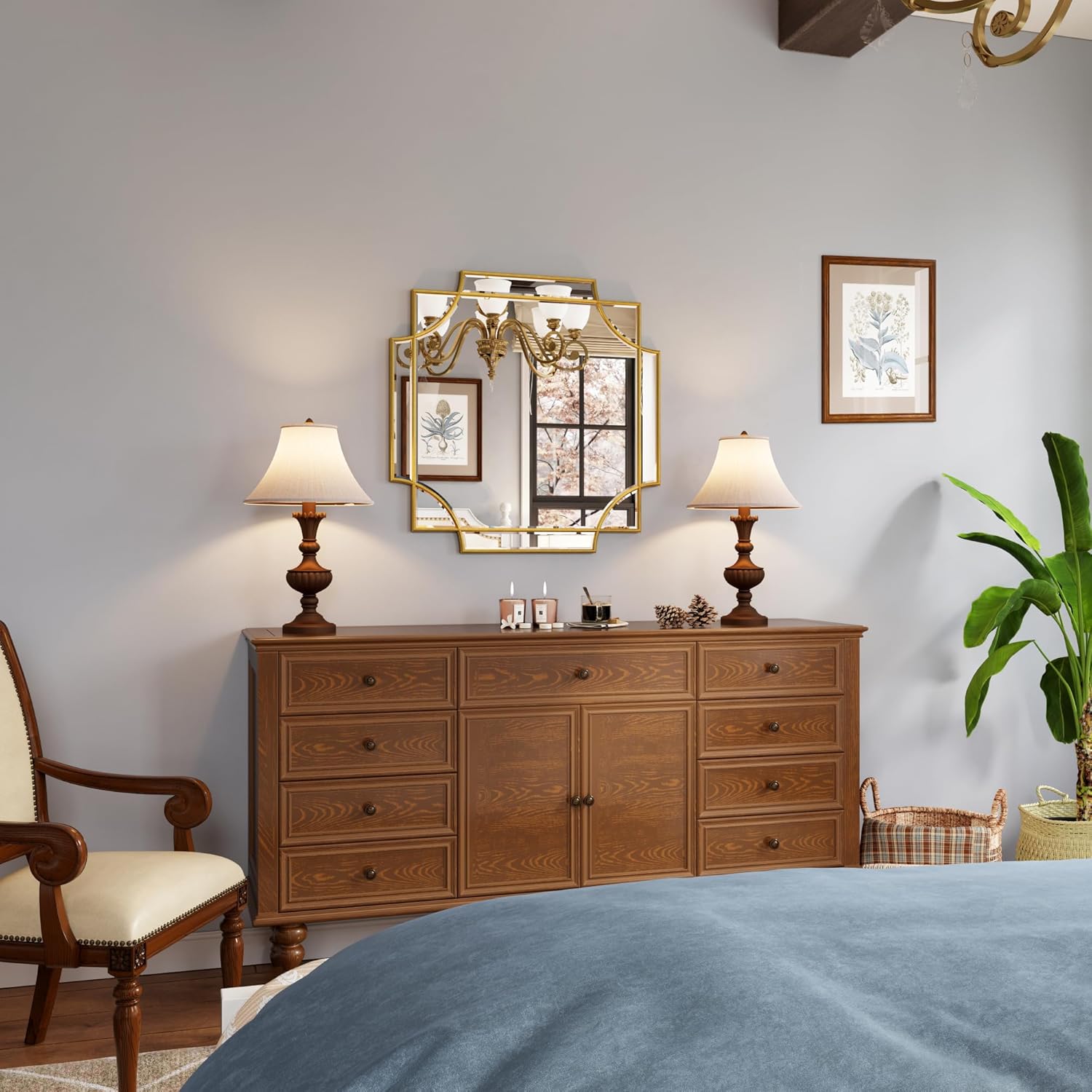 - GOLD LEAF FINISH. The mirror has a hand-applied gold leaf finish. Its inherently textured detailing provides the mirror with unique character and charm. Whether you're using it as a wall art, vanity mirror or bathroom mirror, the large surface area allows it to brighten and expand any space it occupies. This mirror is also a perfect choice for your farmhouse makeover, fireplace mantle or bedroom furniture upgrade.