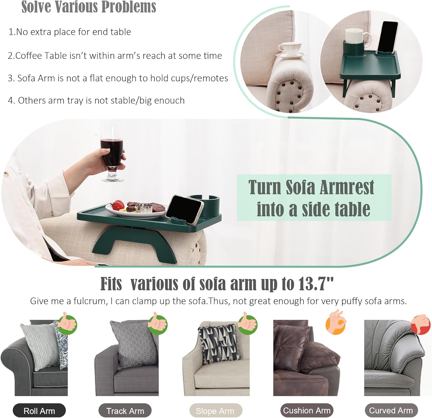 - 🏠Sofa Arm Clip on Tray Table🏠: the Spring Load Arm provide enough strong tension to keep the tray in place. There is anti-slip pad under the tray and on the leg, which ensure the stablility and would not harm your sofa/couch itself.Fit couch/sofa arm within 13.7" among roung/square/curved shape.【Measure Your Couch Arm Before Ordering】