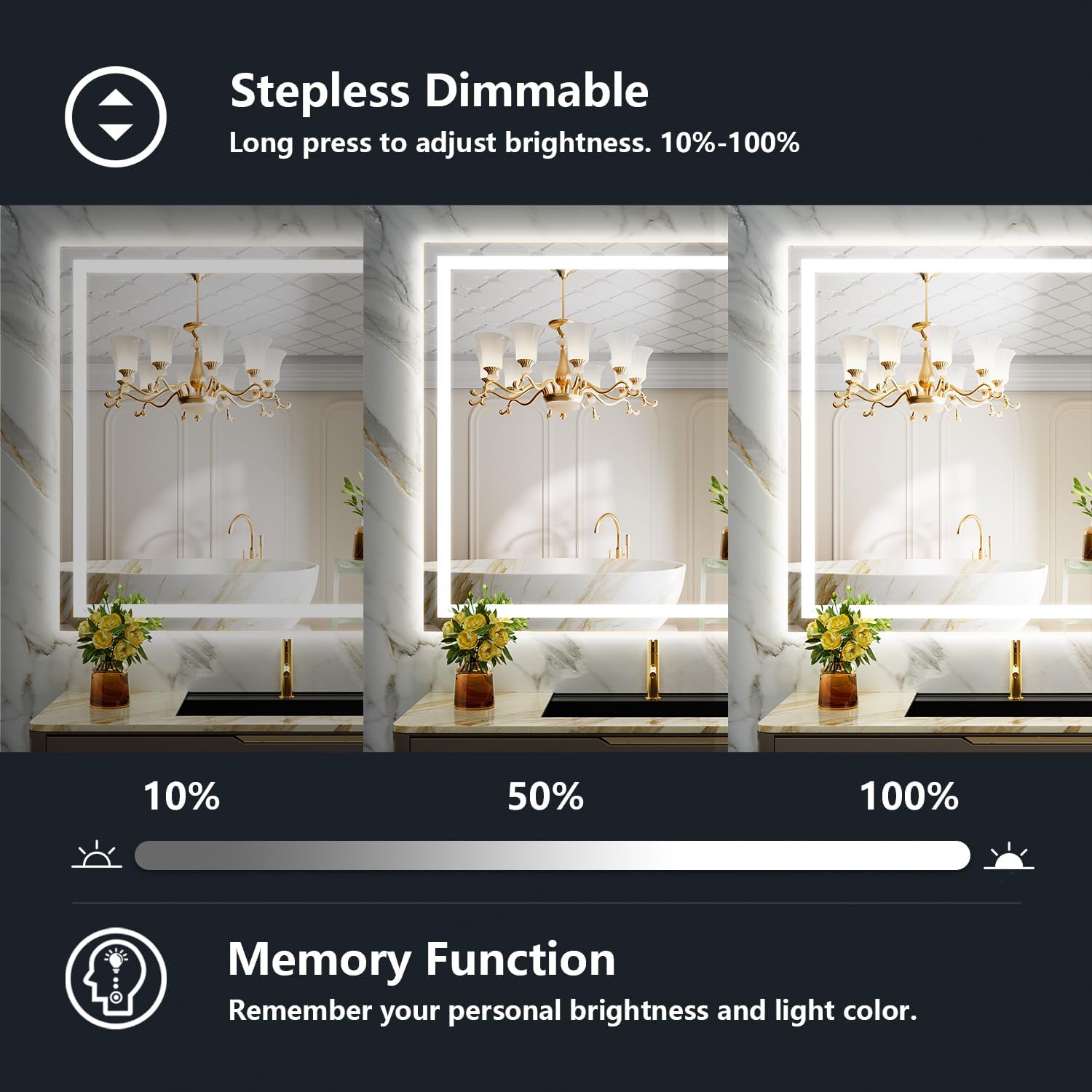 - ✨【Color Changeable & Brightness Adjustable & Memory】- Yeelait lighted mirrors for bathroom wall features multiple light settings that are easily controlled with sensitive touch buttons. Short press the button to change the light color: White (6000K) - Neutral (4000K) - Warm(3000K), long press the button to dim the brightness to your comfortable level (100%~10%). The Smart Memory Function will record the lighting setting and keep the previous lighting status after turning off and on.