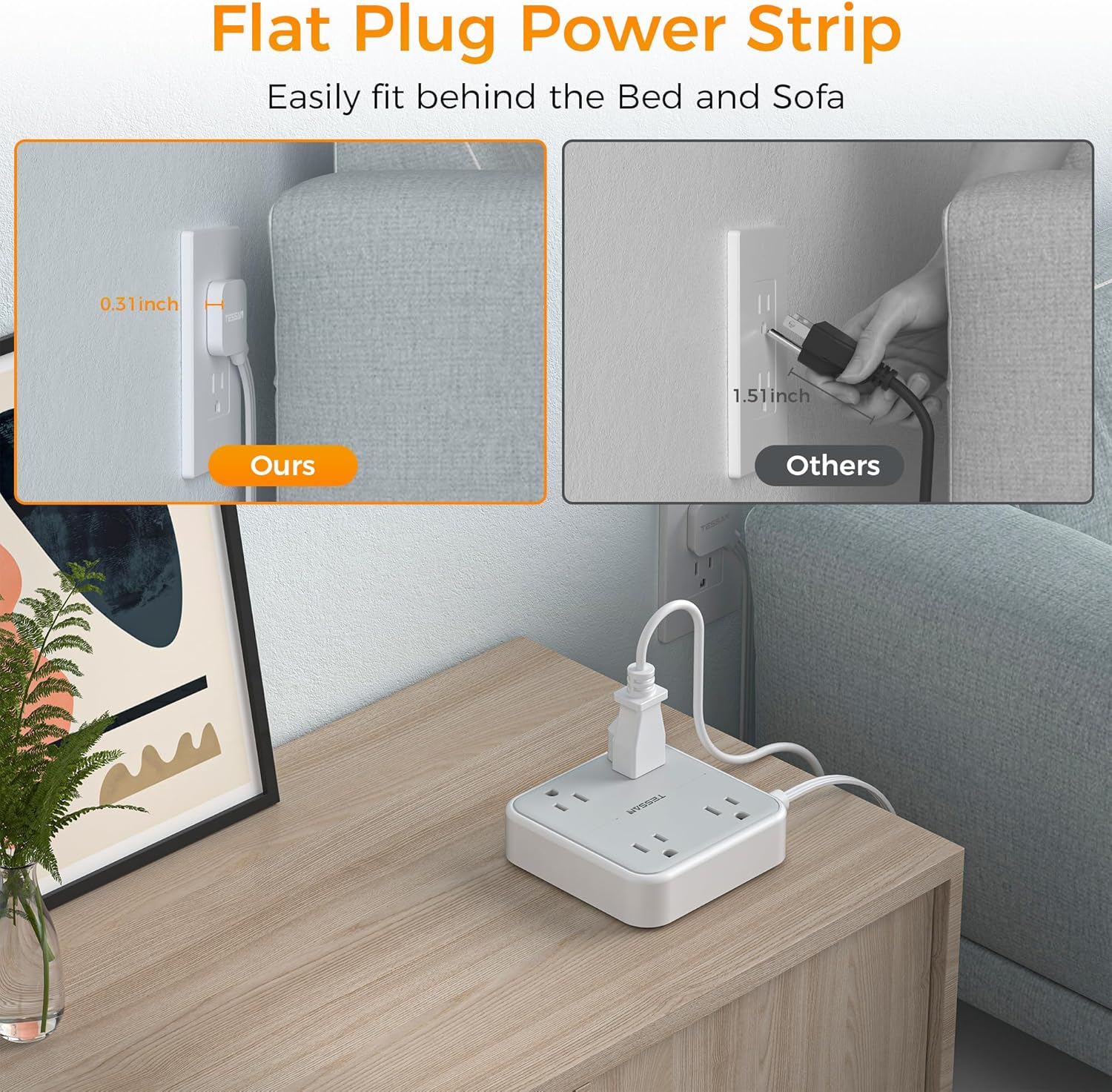 - Flat Plug Extension Cord: With only 0.31 in ultra thin flat head design, TESSAN low profile flat wall plug can easily fit in tight spots and hide behind sofa, bed, nightstand or other furniture, sitting flush against the wall; 45° right angle design create an extra space for other plug below without blocking