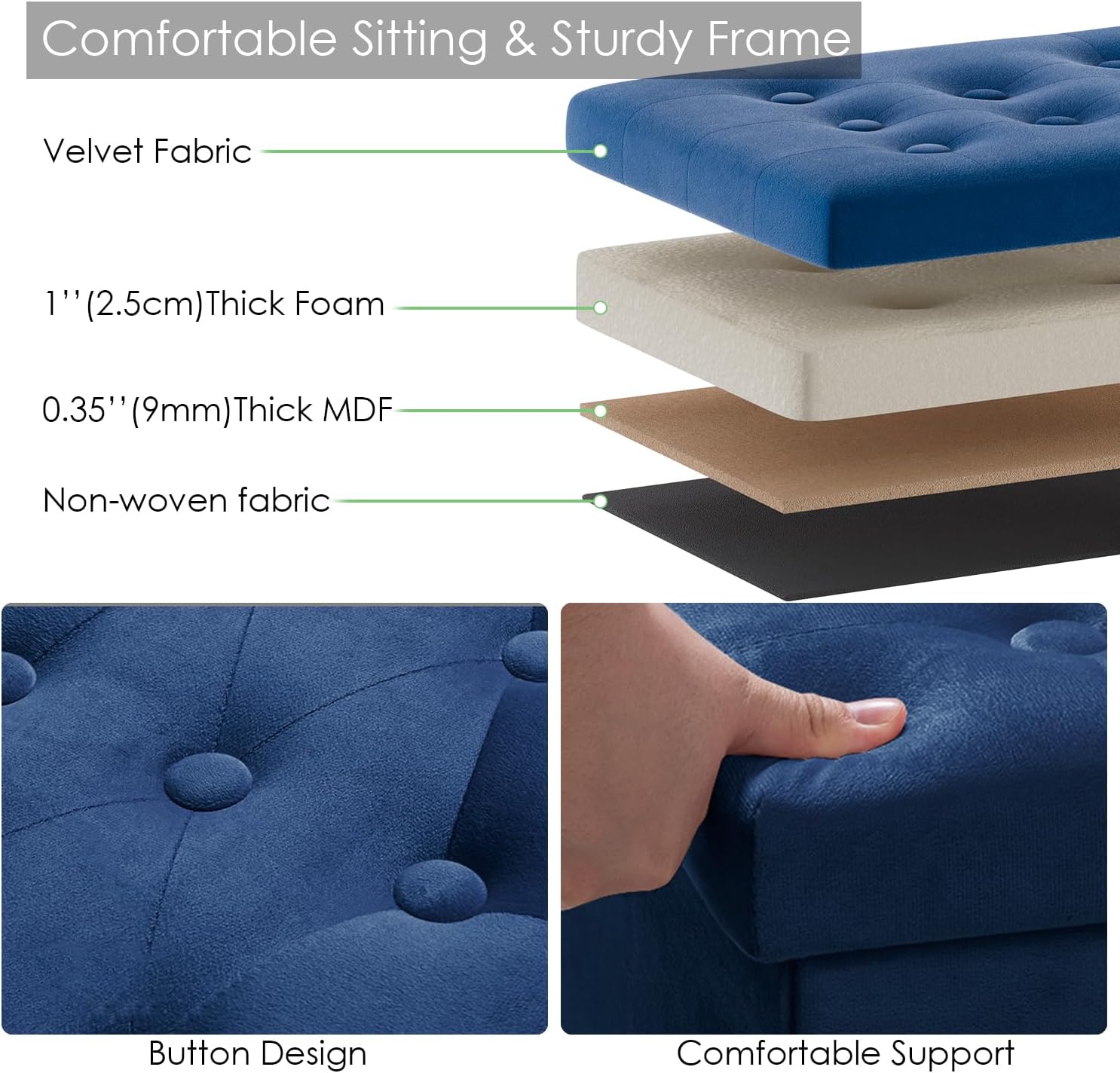 - ćSTURDY AND DURABLEć: Beautiful durable Velvet and thick spong is comfortable and elegant, Thickened E1 Standard MDF construction can afford 200kg/450lbs, sturdy & durable ensures the ottoman's place in your home for a long time.