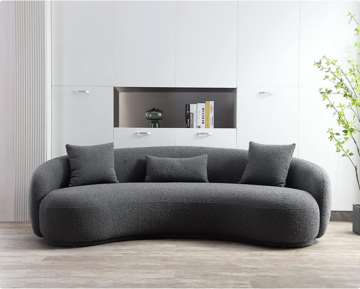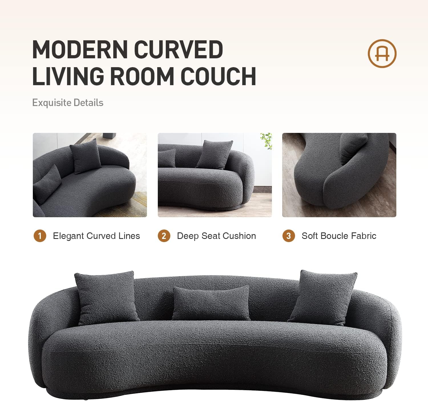 - High-quality boucle fabric sofa - This curved couch sofa's skin-friendly boucle fabric and solid wood frame set a new comfort standard. Experience unparalleled relaxation every time you sit or lie down.
