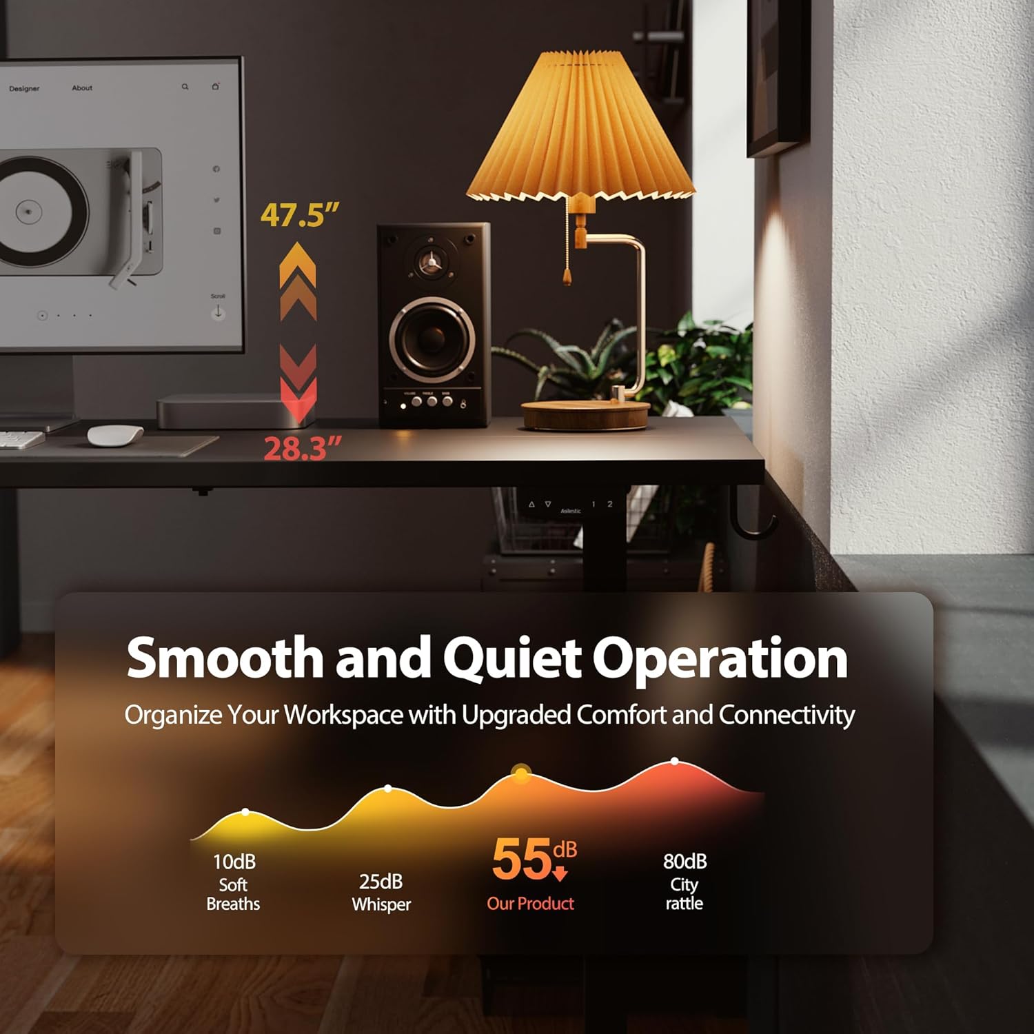 - 【Adjustable Height with Memory Presets】 Easily adjust the desk height between 28'' and 45'' with the quiet electric motor (operating below 55 dB). The ergonomic design helps reduce long-term sitting fatigue, promoting better health. Two memory buttons allow you to save and switch to your preferred heights effortlessly.