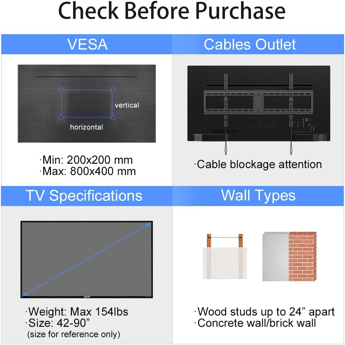 - Universal Compatibility – Supports most 42-90" TVs weighing up to 154 lbs, with VESA compatibility for mounting holes up to 800x400mm. Perfect for flat-panel LED, LCD, and OLED TVs.