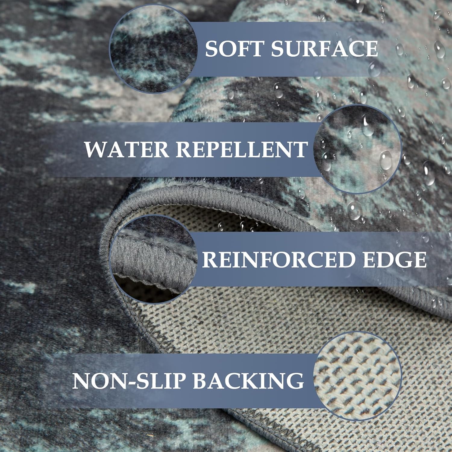 - Tides Series – Effortless style that flows with your life.This modern machine-washable non-slip rug features reinforced edges and a low-pile design that resists dirt. Its water-repellent surface makes spills easy to clean - liquids bead up for quick wiping. Simply machine wash in cold water (no bleach) to refresh. The non-slip backing keeps it securely in place. A perfect blend of function and contemporary design for active homes.