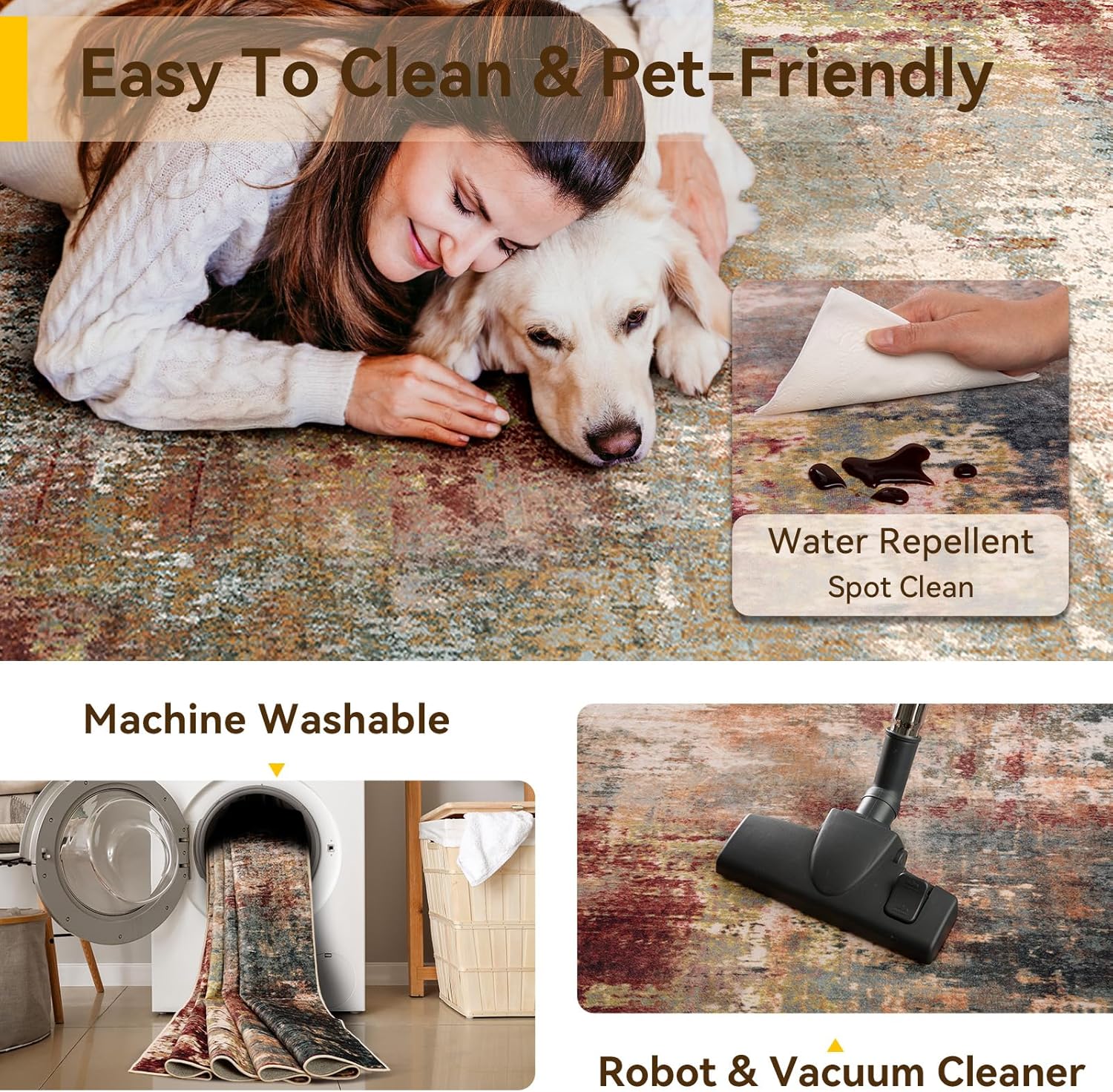 Washable Area Rugs 6ft Non-Slip Modern Abstract Soft for Living Room Entryway Bedroom Nursery, Print Pattern, Brown Rust Red Multi
