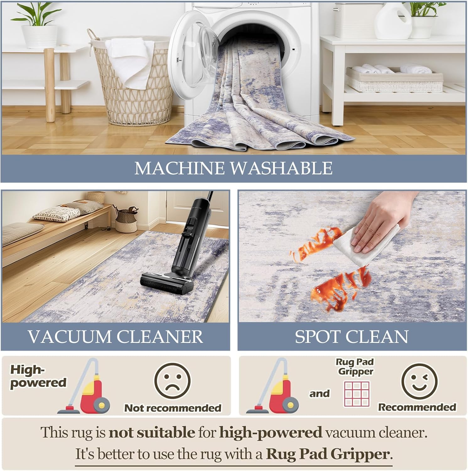 - Tides Series – Effortless style that flows with your life.This modern machine-washable non-slip rug features reinforced edges and a low-pile design that resists dirt. Its water-repellent surface makes spills easy to clean - liquids bead up for quick wiping. Simply machine wash in cold water (no bleach) to refresh. The non-slip backing keeps it securely in place. A perfect blend of function and contemporary design for active homes.
