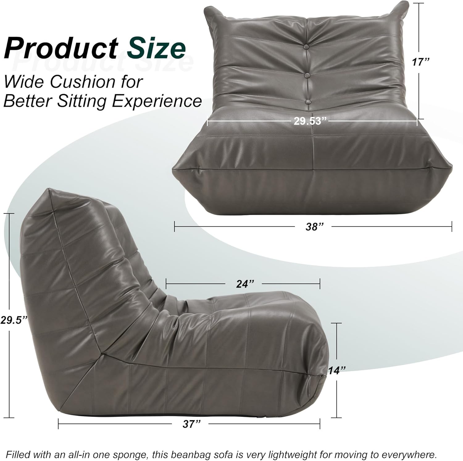 - 【Versatile Usage】With the size of 37"L x 38"W x 29.5"H. Filled with all-in-one sponge, this beanbag couch is only 20.46lbs, very lightweight for moving to anywhere such as dorm, home and even office. Whether you need a gaming chair, a meditation sofa with back support, or a floor couch for watching TV, this leisure chair is the perfect complement to any combination sofa. And its faux leather is very easy to clean just with a wet cloth.