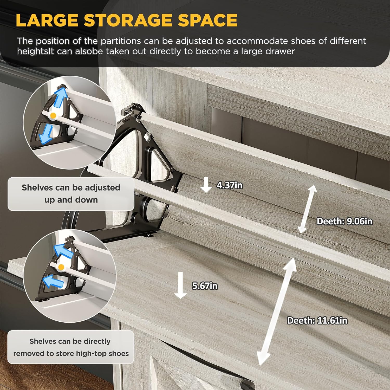 - Large Capacity Shoe Cabinet: The drawer shoe cabinet can store up to 32-40 pairs. There are 4 upper and lower drawers, each drawer contains two layers of storage space. The panel can be adjusted or removed in two grooves to accommodate different heights and sizes of flats, mid boots or heels! Slippers or sweeping robots can be placed on the bottom. There is a fence on the top, ideal for placing potted plants, ornaments, socks and keys, without worrying about falling