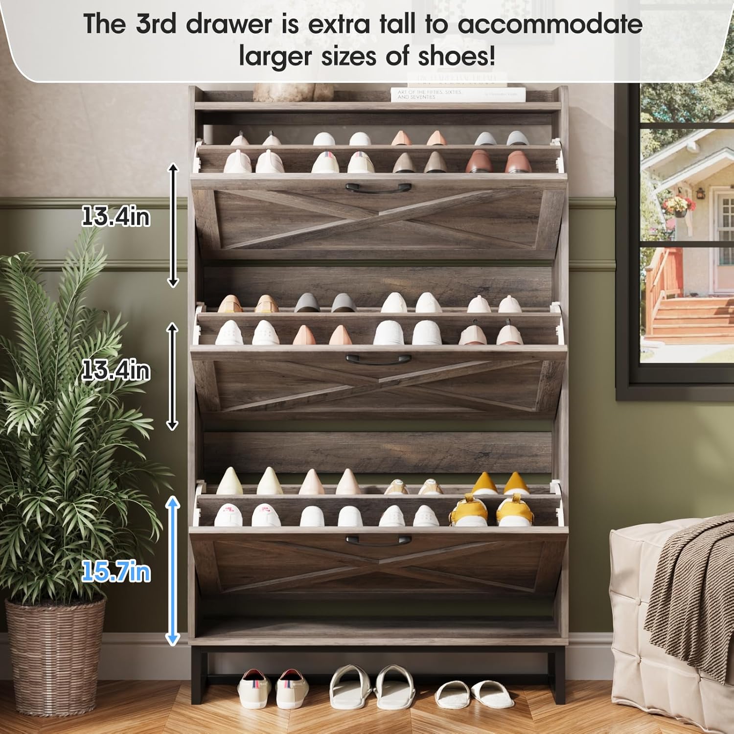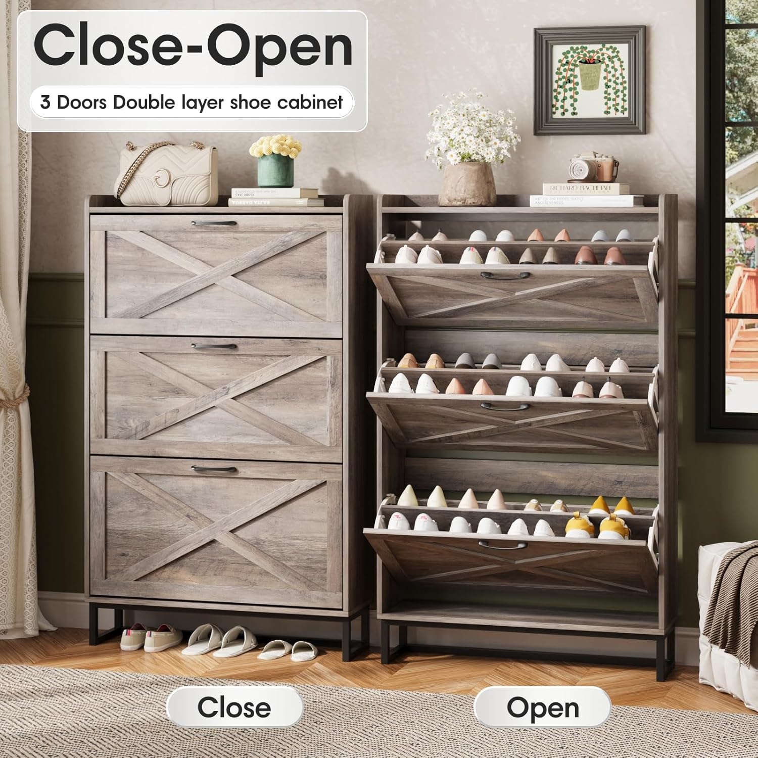 - Entryway Shoe Cabinet: The hidden shoe storage cabinet with 3 flip doors, stylish and simple washed gray makes it a neat and beautiful finish and looks great in many different home styles. Perfect for placing in the entryway, hallway, living room, or porch, provides a neat looking in your home and space saving