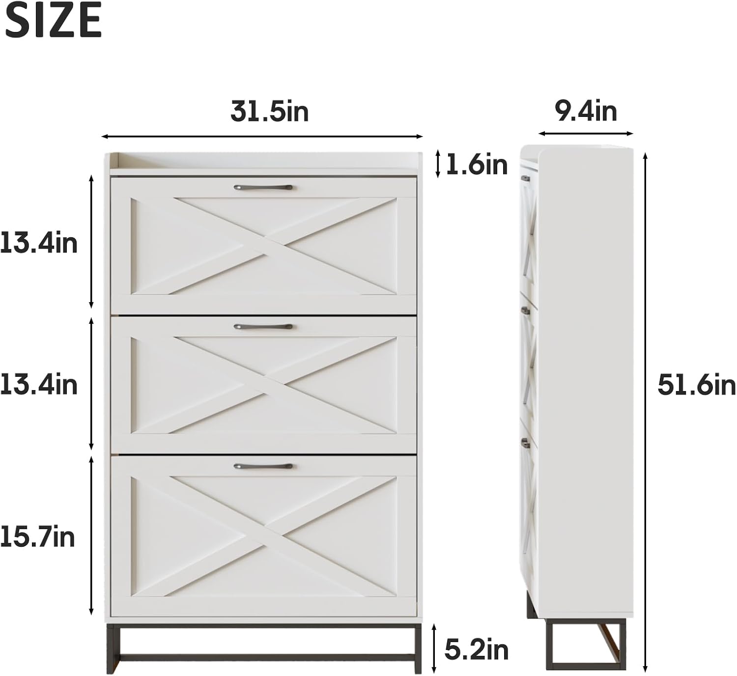 - Entryway Shoe Cabinet: The hidden shoe storage cabinet with 3 flip doors, stylish and simple white makes it a neat and beautiful finish and looks great in many different home styles. Perfect for placing in the entryway, hallway, living room, or porch, provides a neat looking in your home and space saving