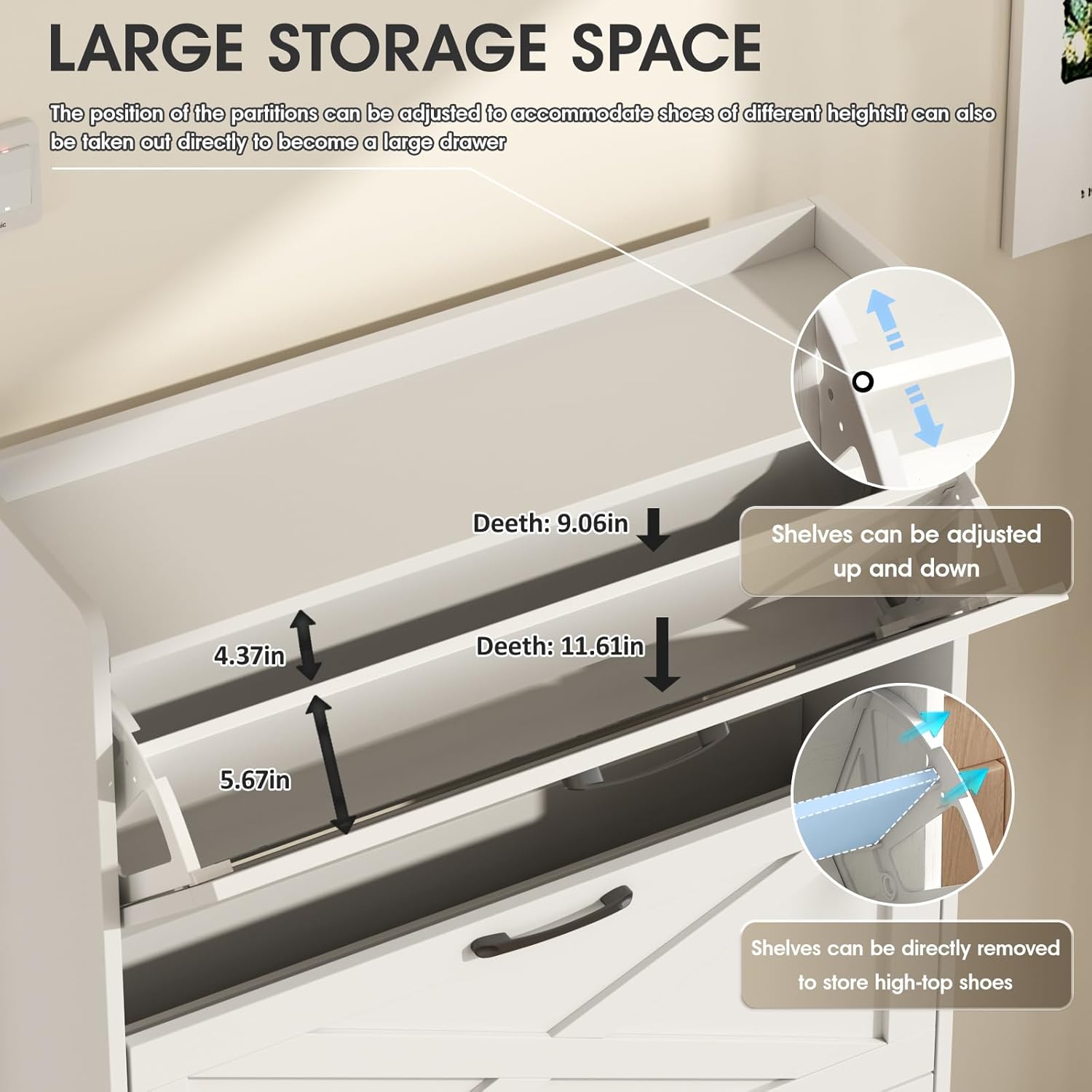 - Flip Drawers Shoe Cabinet: The modern freestanding shoe cabinet adopts the design of space-saving flip drawers, which is easy to open and close. Compared with ordinary shoe racks, this narrow shoe cabinet can be placed in a narrow space, keeping your shoes away from dust and preventing pets from biting your shoes