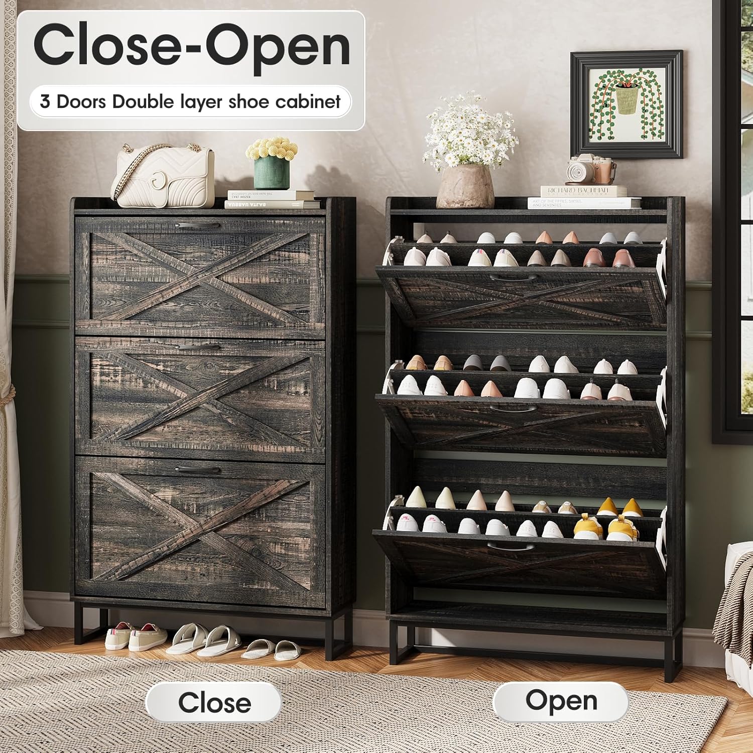 - Entryway Shoe Cabinet: The hidden shoe storage cabinet with 3 flip doors, stylish and simple dark rustic oak makes it a neat and beautiful finish and looks great in many different home styles. Perfect for placing in the entryway, hallway, living room, or porch, provides a neat looking in your home and space saving